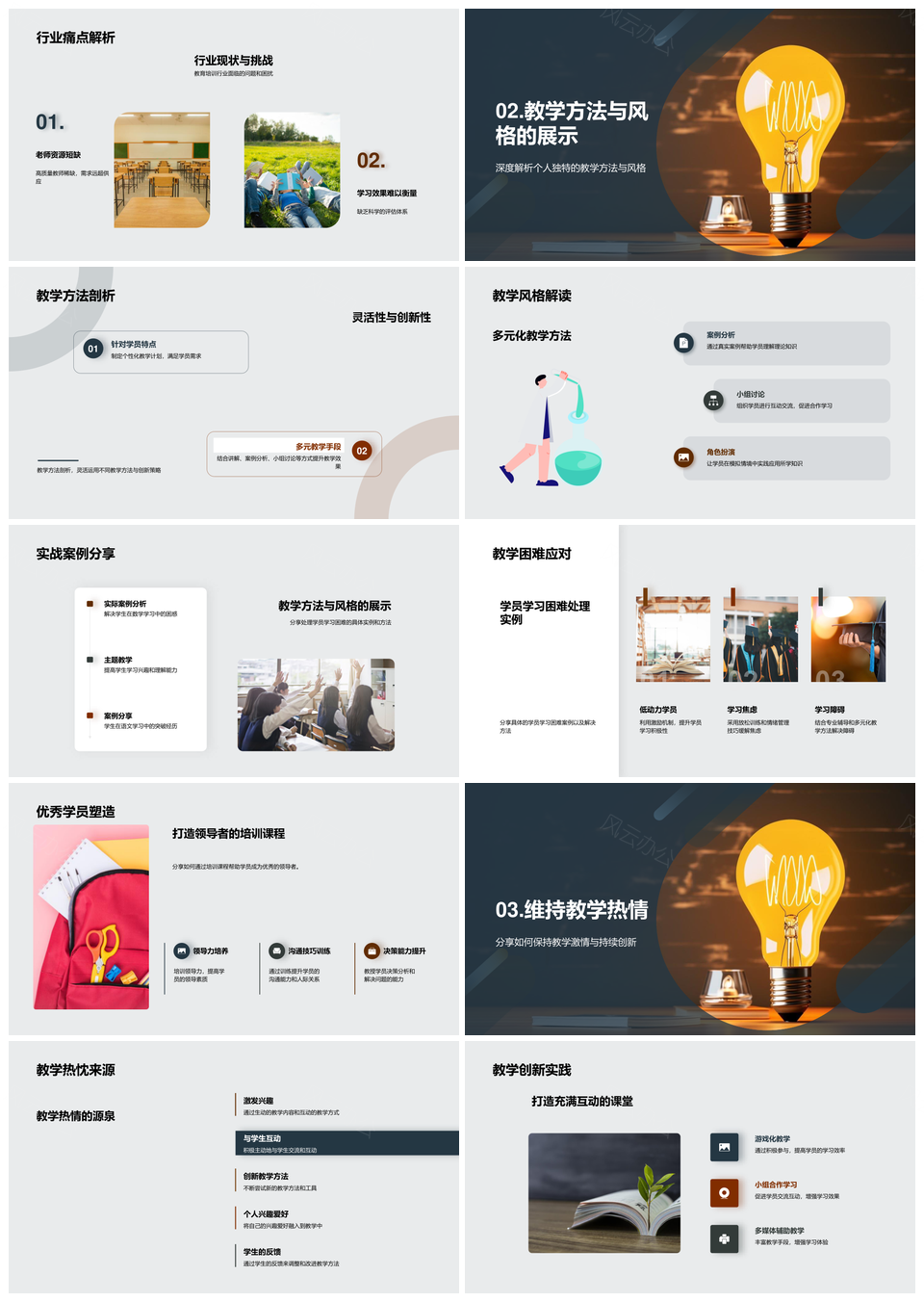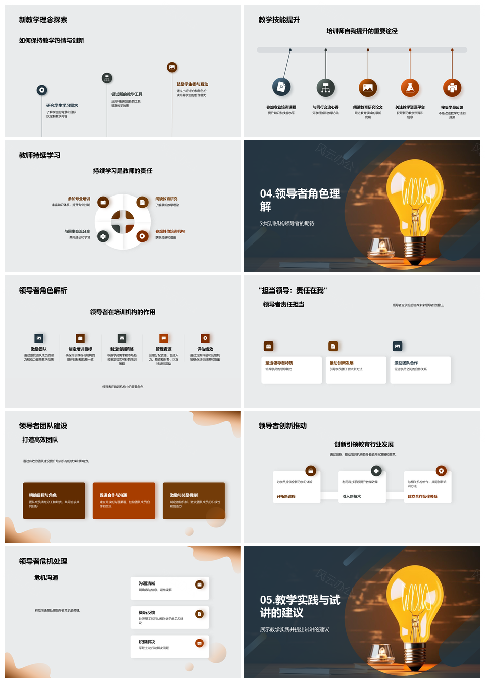 风云办公提供的教育领导力创新教学法与培训师风格PPT模板,下载格式为pptx,一共33页,作品中文字及图均可以修改和编辑,图片更改请在作品中右键图片并更换,文字修改请直接点击文字进行修改。