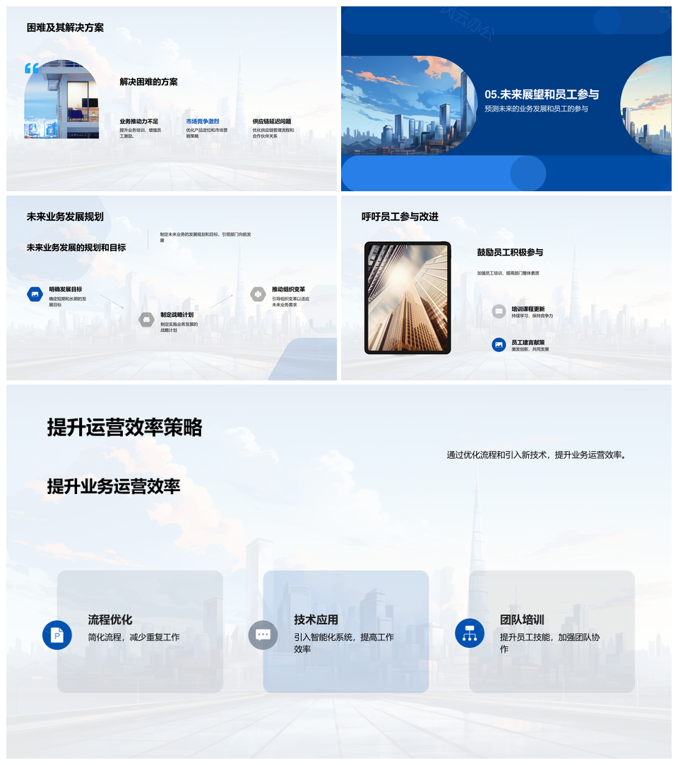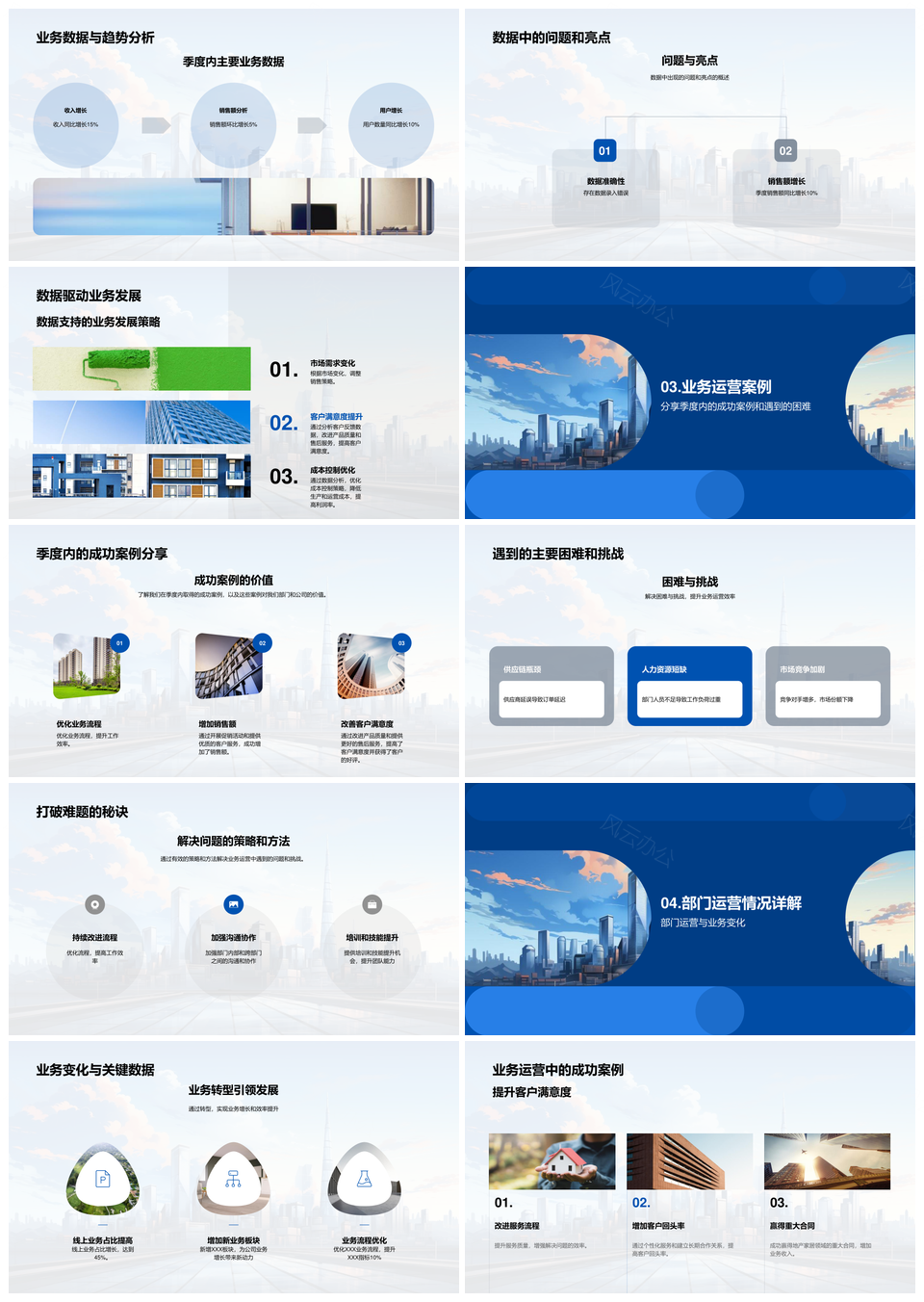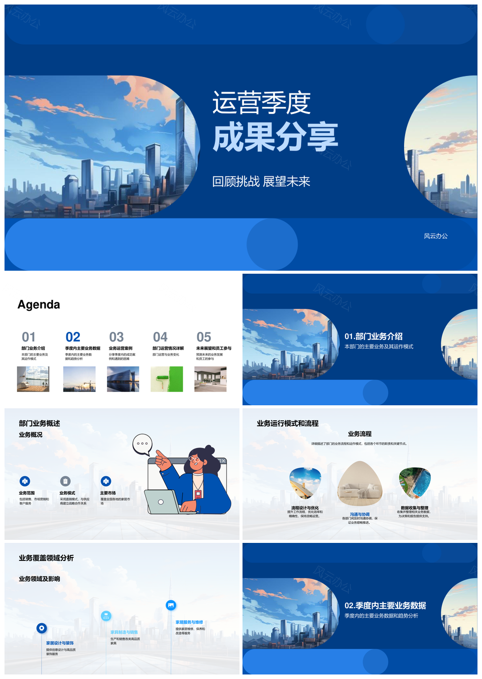 风云办公提供的部门季度运营成果案例与摩天未来蓝图PPT模板,下载格式为pptx,一共23页,作品中文字及图均可以修改和编辑,图片更改请在作品中右键图片并更换,文字修改请直接点击文字进行修改。
