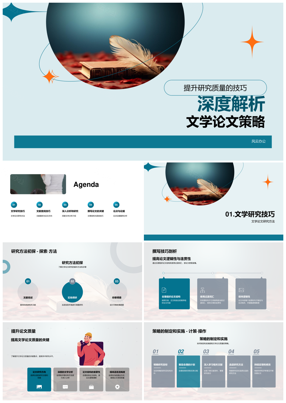 风云办公提供的文学论文研究策略与撰写技巧解析PPT模板,下载格式为pptx,一共25页,作品中文字及图均可以修改和编辑,图片更改请在作品中右键图片并更换,文字修改请直接点击文字进行修改。