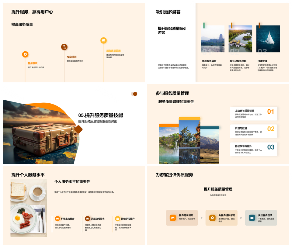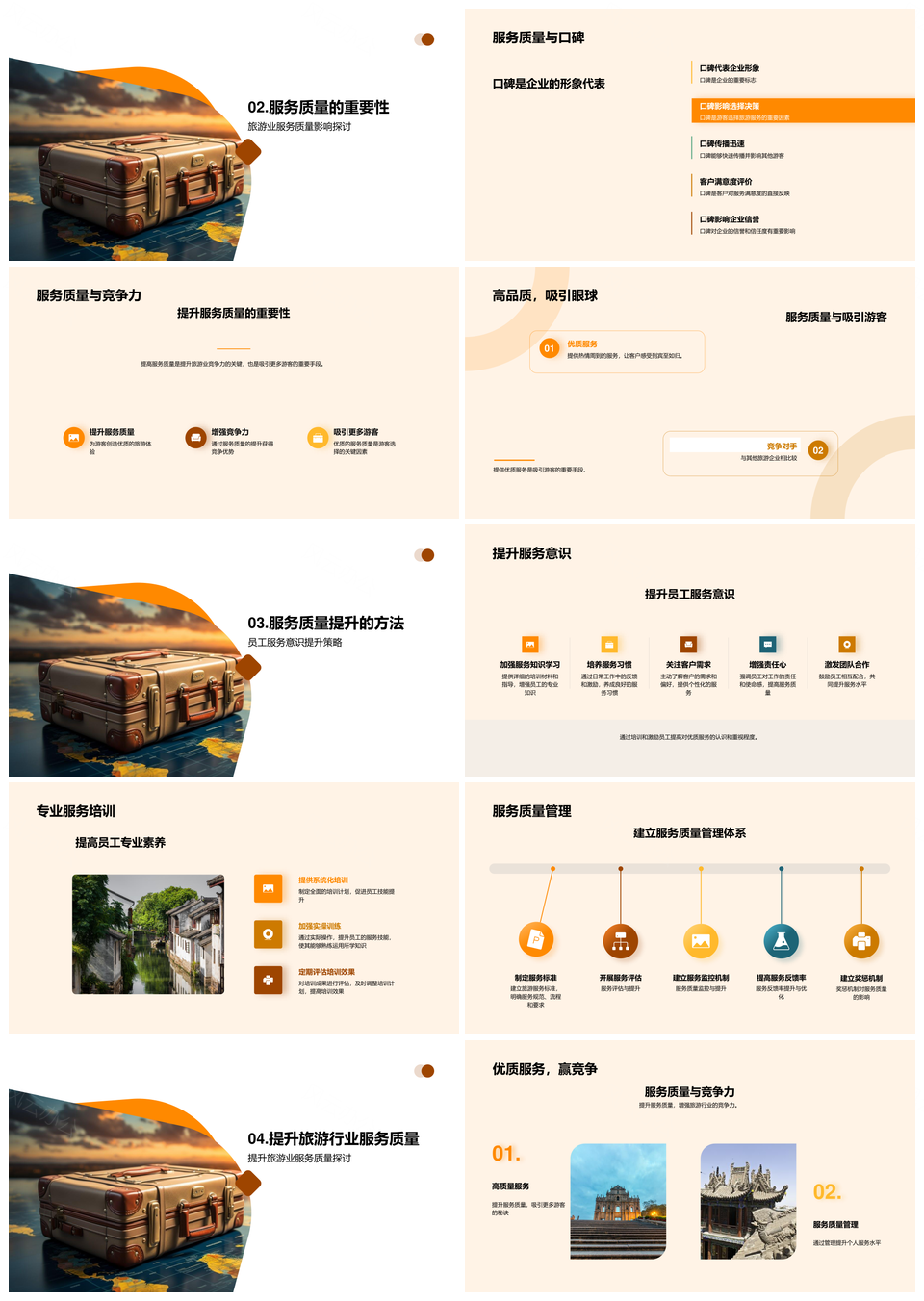 风云办公提供的旅游服务升级优化全流程技能培训PPT模板,下载格式为pptx,一共24页,作品中文字及图均可以修改和编辑,图片更改请在作品中右键图片并更换,文字修改请直接点击文字进行修改。
