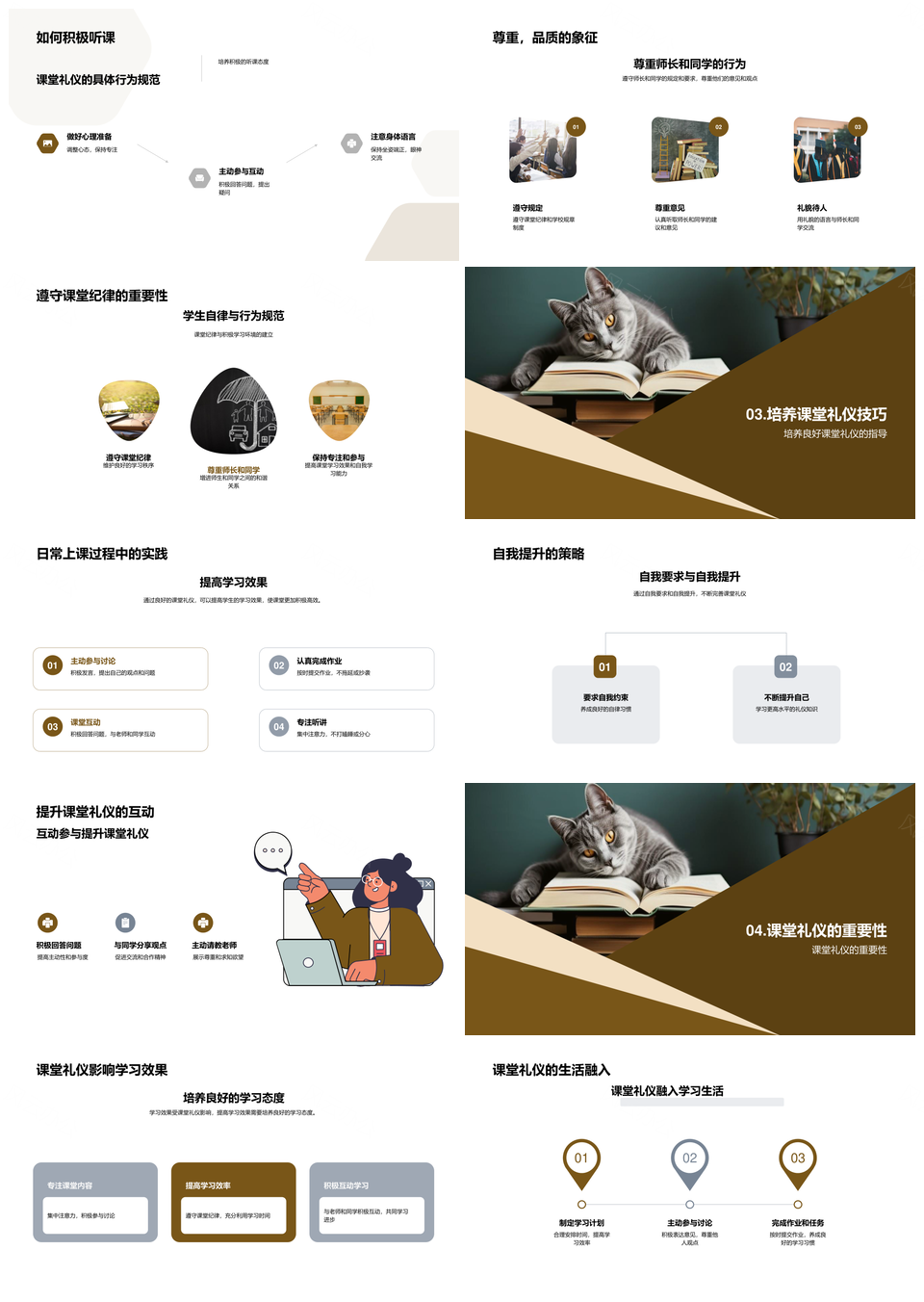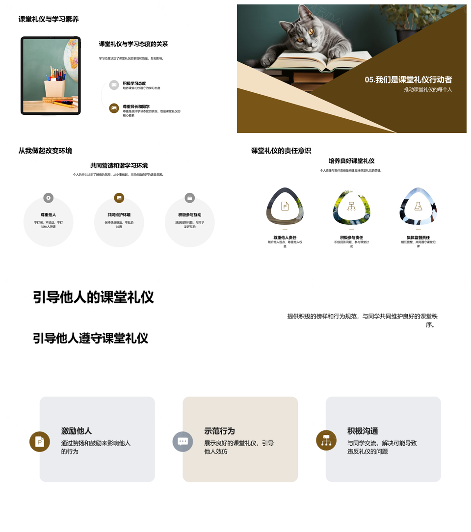 这是一张课堂礼仪教育尊师守纪共提升PPT模板,包含课堂、礼仪、教育、尊师、守纪、提升等主题内容,也可用作课堂礼仪教育尊师、礼仪教育尊师守纪、教育尊师守纪提升、课堂礼仪教育、礼仪教育尊师、教育尊师守纪、尊师守纪提升、课堂礼仪、礼仪教育、教育尊师、尊师守纪、守纪提升、课堂教育、教育提升、教育守纪等PPT场景使用。 风云办公提供的课堂礼仪教育尊师守纪共提升PPT模板,下载格式为pptx,一共23页,作品中文字及图均可以修改和编辑,图片更改请在作品中右键图片并更换,文字修改请直接点击文字进行修改。