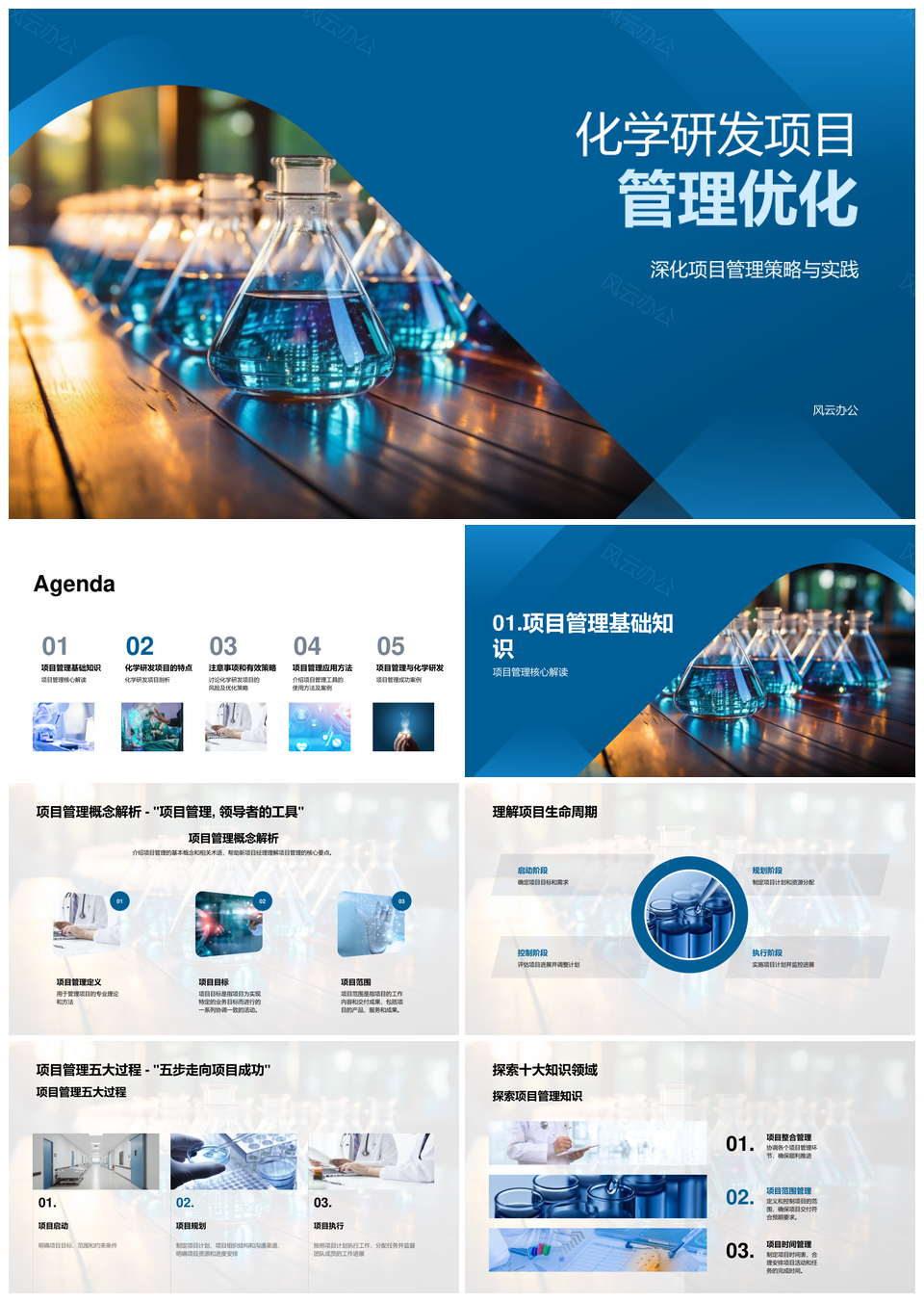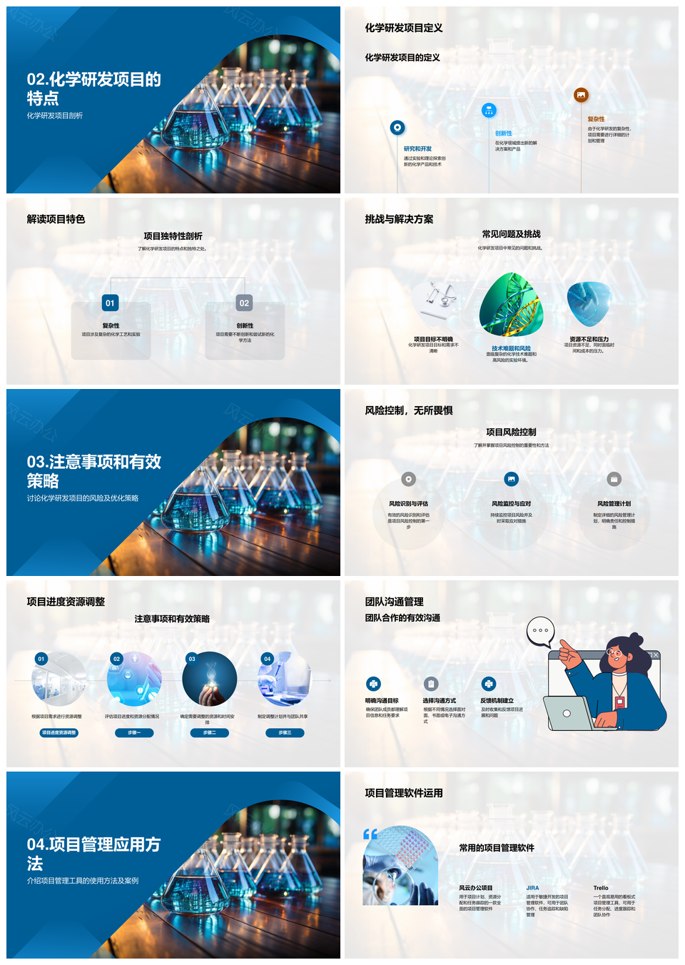 风云办公提供的化学研发项目管理策略全周期风险控制PPT模板,下载格式为pptx,一共24页,作品中文字及图均可以修改和编辑,图片更改请在作品中右键图片并更换,文字修改请直接点击文字进行修改。