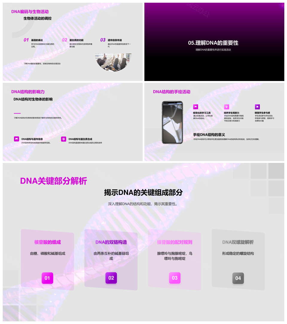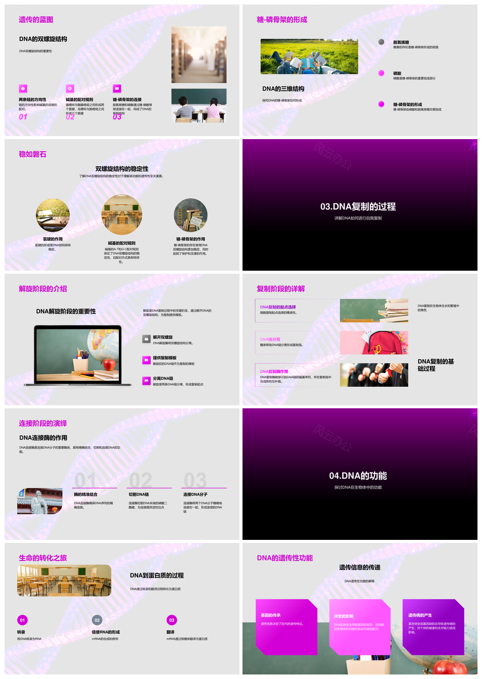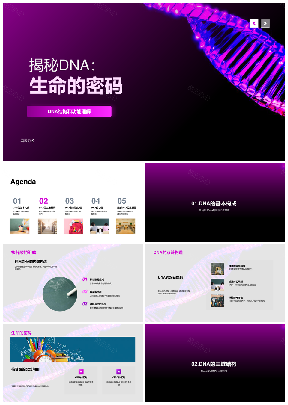 这是一张DNA双螺旋结构复制阶段揭秘生命密码PPT模板,包含DNA双螺旋结构、复制阶段、揭秘、生命密码等主题内容,也可用作DNA双螺旋结构复制阶段揭秘生命密码、DNA双螺旋结构复制阶段、双螺旋结构复制阶段揭秘、复制阶段揭秘生命密码、DNA双螺旋结构复制、双螺旋结构复制阶段、复制阶段揭秘生命、DNA双螺旋结构、双螺旋结构复制、复制阶段揭秘、阶段揭秘生命密码、DNA复制阶段、揭秘生命密码、双螺旋结构、复制阶段、阶段揭秘等PPT场景使用。 风云办公提供的DNA双螺旋结构复制阶段揭秘生命密码PPT模板,下载格式为pptx,一共23页,作品中文字及图均可以修改和编辑,图片更改请在作品中右键图片并更换,文字修改请直接点击文字进行修改。