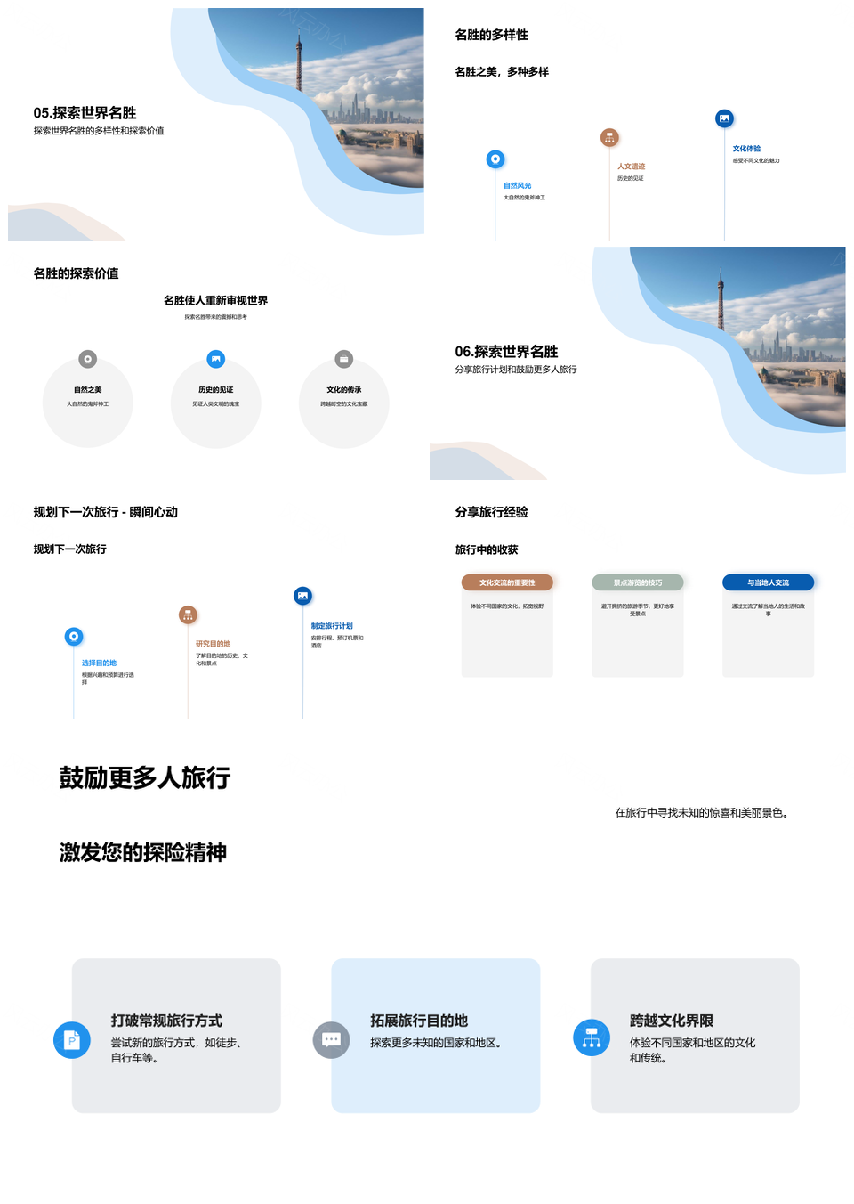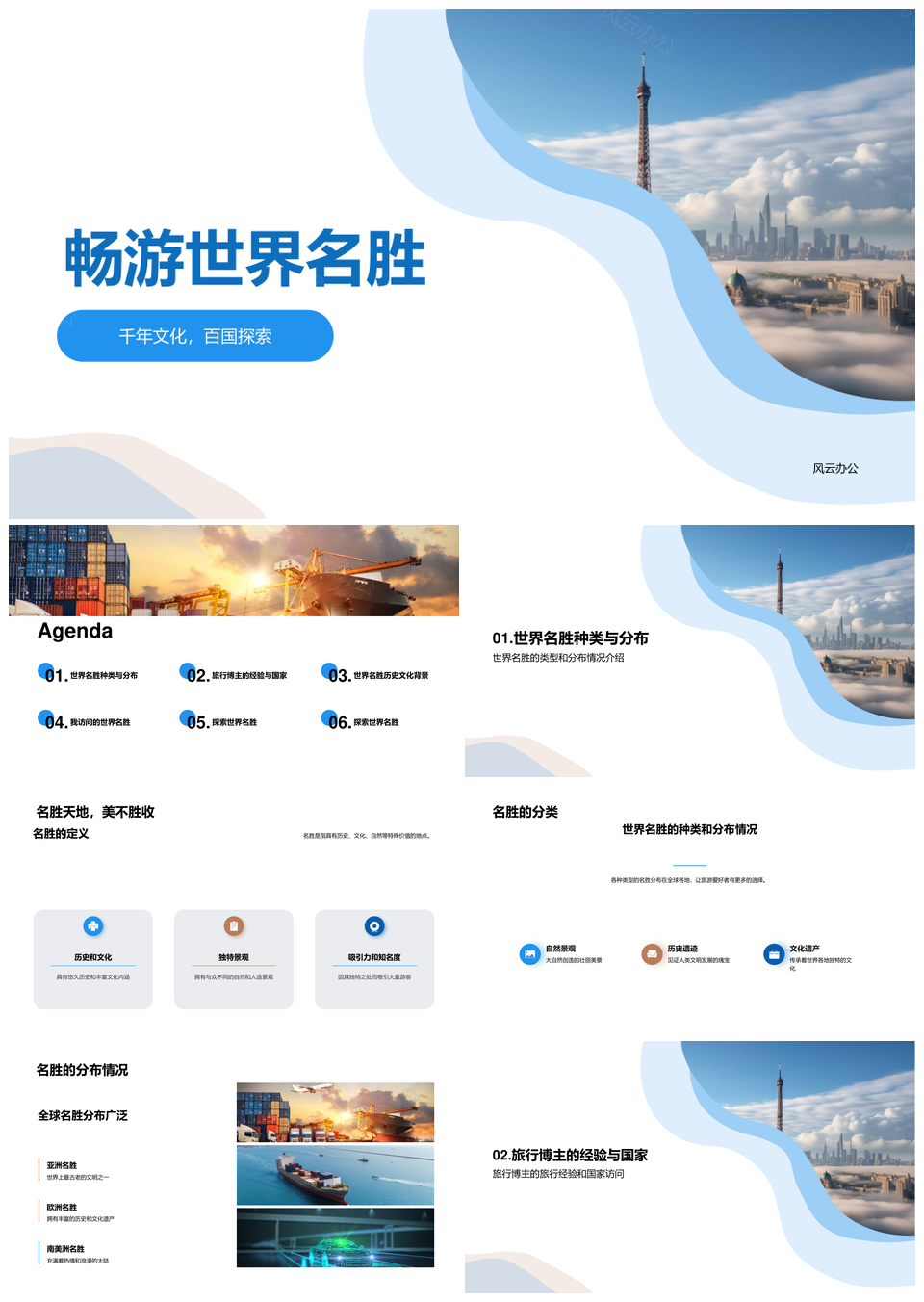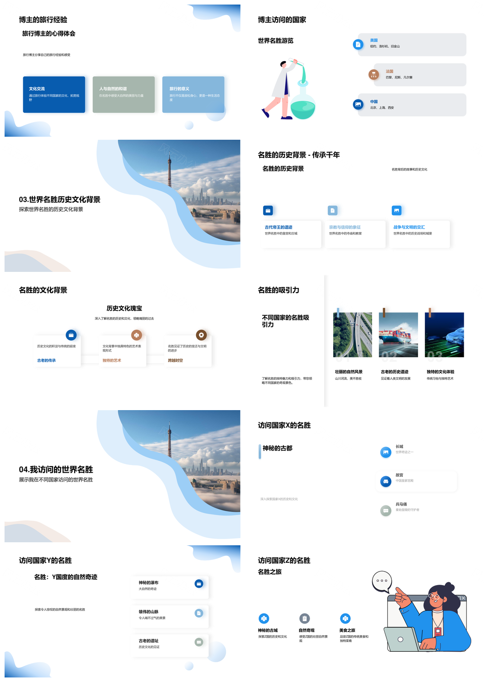 风云办公提供的旅行博主追寻世界名胜足迹PPT模板,下载格式为pptx,一共25页,作品中文字及图均可以修改和编辑,图片更改请在作品中右键图片并更换,文字修改请直接点击文字进行修改。