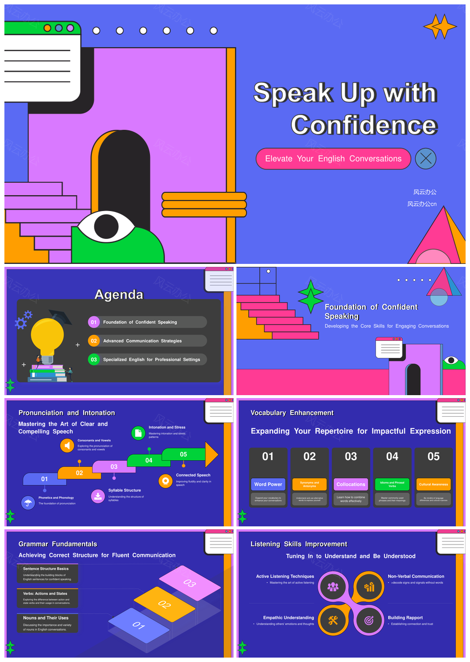 这是一张英语口语演讲技巧互动教学自信学习氛围PPT模板,包含英语口语、演讲技巧、互动教学、自信、学习氛围等主题内容,也可用作英语口语演讲技巧、英语口语互动教学、英语互动教学自信、互动教学自信学习、教学自信学习氛围、口语演讲技巧互动、演讲技巧互动教学、技巧互动教学自信、自信学习氛围、英语口语演讲、口语演讲技巧、演讲技巧互动、技巧互动教学、互动教学自信、教学自信学习等PPT场景使用。 风云办公提供的英语口语演讲技巧互动教学自信学习氛围PPT模板,下载格式为pptx,一共21页,作品中文字及图均可以修改和编辑,图片更改请在作品中右键图片并更换,文字修改请直接点击文字进行修改。