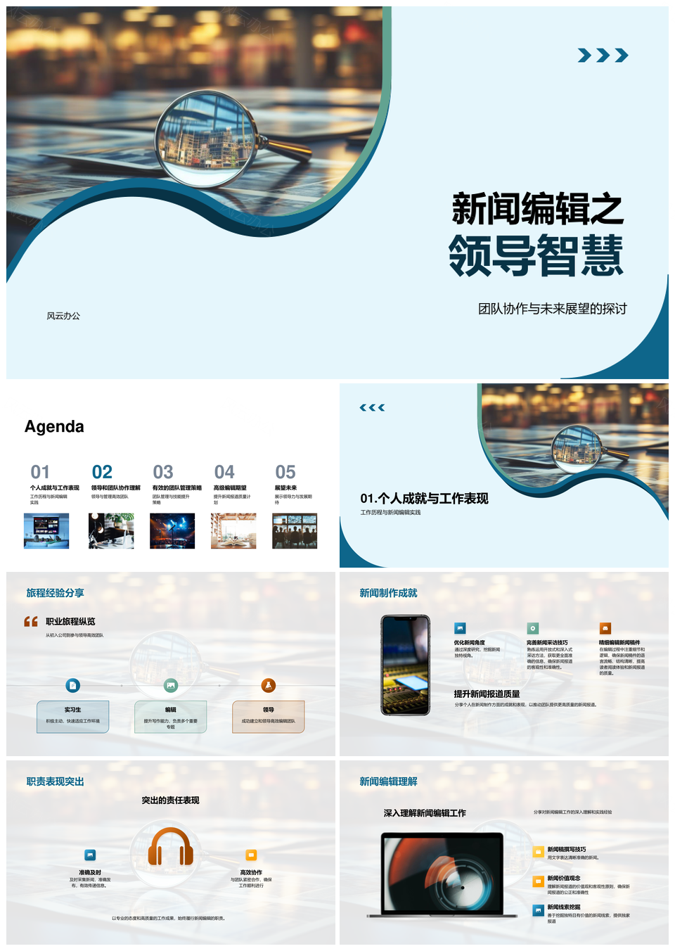 风云办公提供的新闻编辑领导智慧团队协作未来展望PPT模板,下载格式为pptx,一共30页,作品中文字及图均可以修改和编辑,图片更改请在作品中右键图片并更换,文字修改请直接点击文字进行修改。