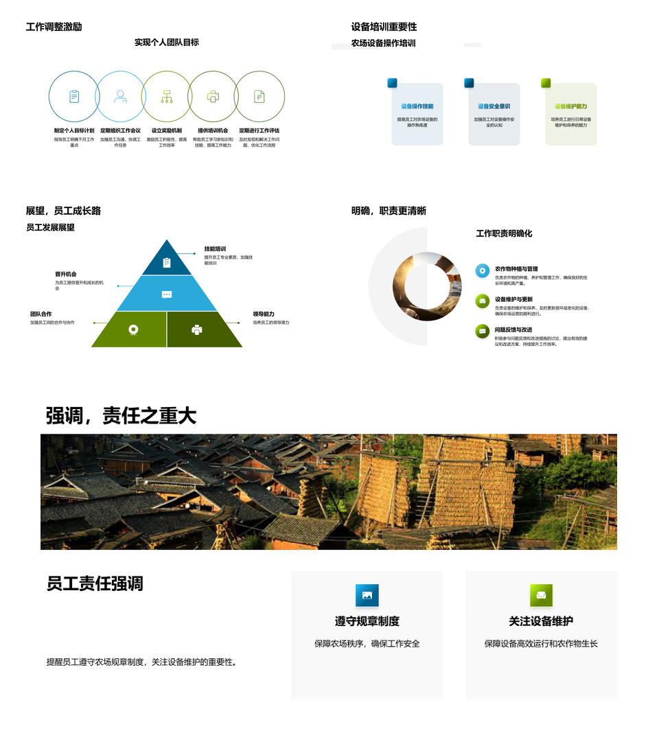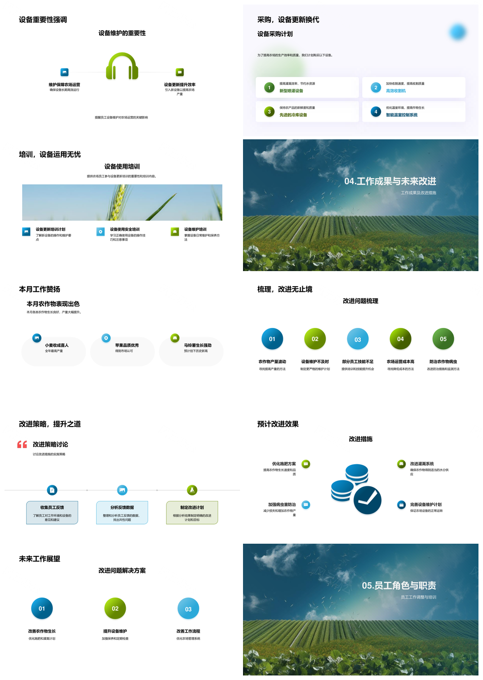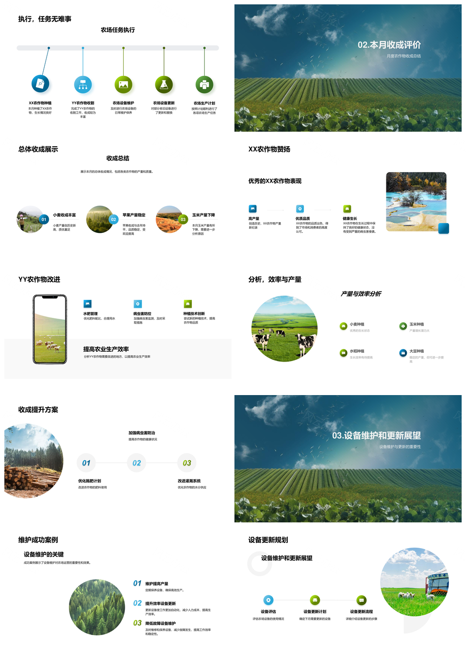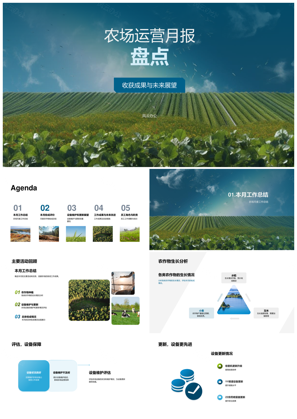 这是一张农场运营月报作物生长设备维护收成效率培训景观PPT模板,包含农场运营、月报、作物生长、设备维护、收成效率、培训、景观等主题内容,也可用作农场运营月报作物、作物生长设备维护、设备维护收成效率、收成效率培训景观、农场运营月报、运营月报作物、月报作物生长、作物生长设备、生长设备维护、设备维护收成、维护收成效率、收成效率培训、效率培训景观、农场运营、作物生长等PPT场景使用。 风云办公提供的农场运营月报作物生长设备维护收成效率培训景观PPT模板,下载格式为pptx,一共33页,作品中文字及图均可以修改和编辑,图片更改请在作品中右键图片并更换,文字修改请直接点击文字进行修改。