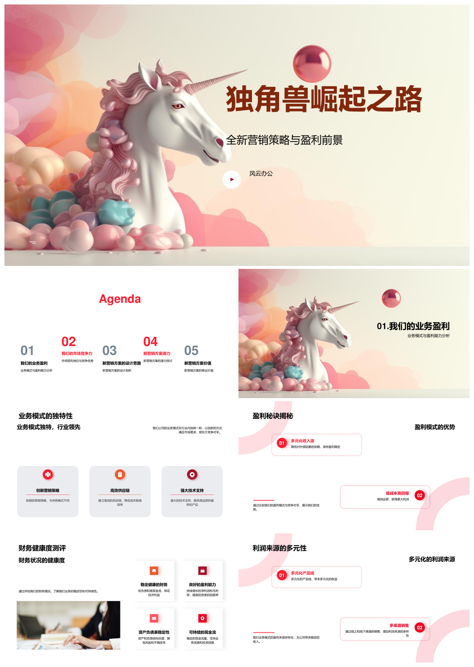 风云办公提供的独角兽崛起新营销策略与盈利模式探索PPT模板,下载格式为pptx,一共33页,作品中文字及图均可以修改和编辑,图片更改请在作品中右键图片并更换,文字修改请直接点击文字进行修改。