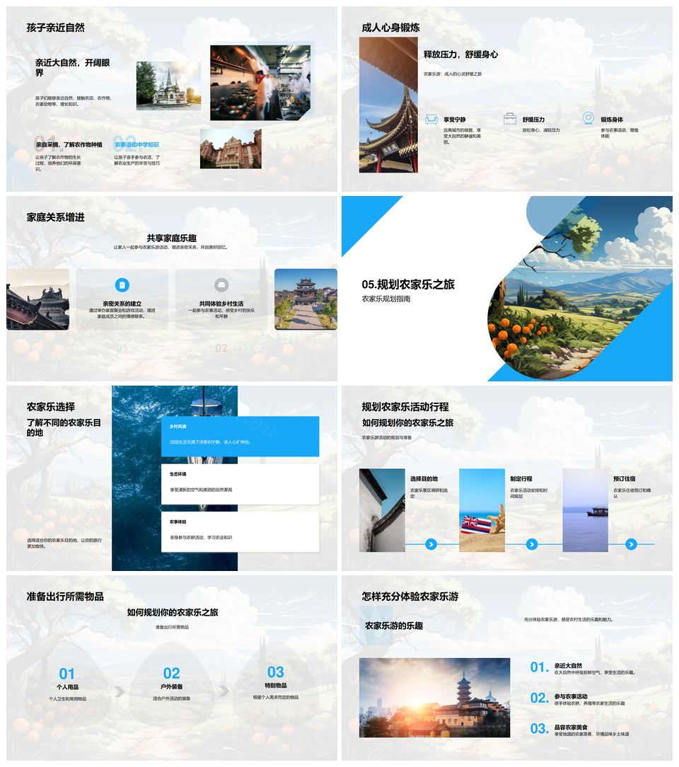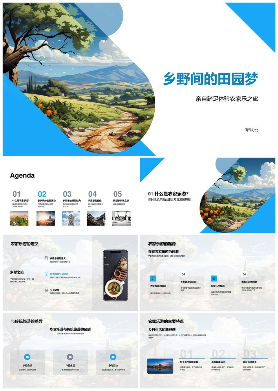 这是一张田园乐游农事采摘美食乡景行PPT模板,包含田园、乐游、农事、采摘、美食、乡景等主题内容,也可用作田园乐游农事采摘、乐游农事采摘美食、农事采摘美食乡景、田园乐游农事、乐游农事采摘、农事采摘美食、采摘美食乡景、田园乐游、乐游农事、农事采摘、采摘美食、美食乡景、田园农事、农事美食、农事乡景等PPT场景使用。 风云办公提供的田园乐游农事采摘美食乡景行PPT模板,下载格式为pptx,一共26页,作品中文字及图均可以修改和编辑,图片更改请在作品中右键图片并更换,文字修改请直接点击文字进行修改。