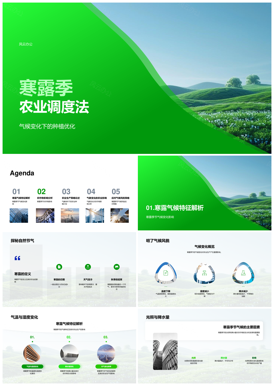 风云办公提供的寒露农业调度法气候种植优化作物调控PPT模板,下载格式为pptx,一共33页,作品中文字及图均可以修改和编辑,图片更改请在作品中右键图片并更换,文字修改请直接点击文字进行修改。