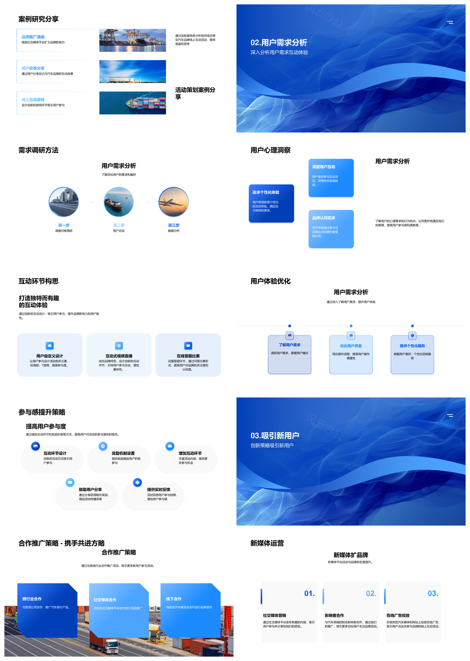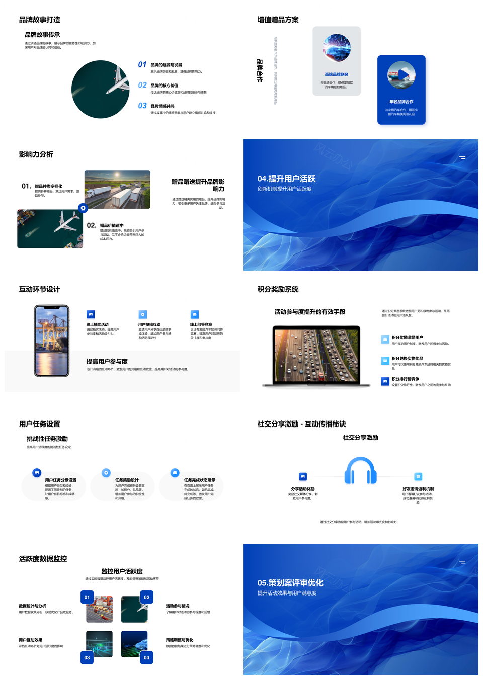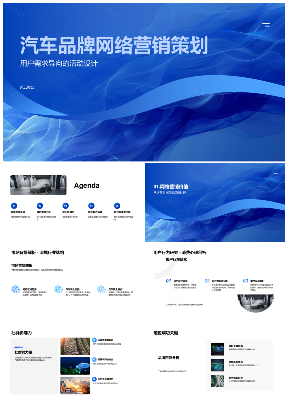 这是一张汽车品牌网络营销策划用户增长活跃社群互动推广优化PPT模板,包含汽车品牌、网络营销、策划、用户增长、活跃、社群、互动、推广、优化等主题内容,也可用作汽车品牌网络营销策划用户增长、网络营销策划用户增长活跃、策划用户增长活跃社群互动、用户增长活跃社群互动推广、活跃社群互动推广优化、汽车品牌网络营销策划、网络营销策划用户增长、策划用户增长活跃、用户增长活跃社群互动、活跃社群互动推广、社群互动推广优化、汽车品牌用户增长活跃、汽车品牌网络营销推广、网络营销推广优化、用户增长推广优化等PPT场景使用。 风云办公提供的汽车品牌网络营销策划用户增长活跃社群互动推广优化PPT模板,下载格式为pptx,一共33页,作品中文字及图均可以修改和编辑,图片更改请在作品中右键图片并更换,文字修改请直接点击文字进行修改。