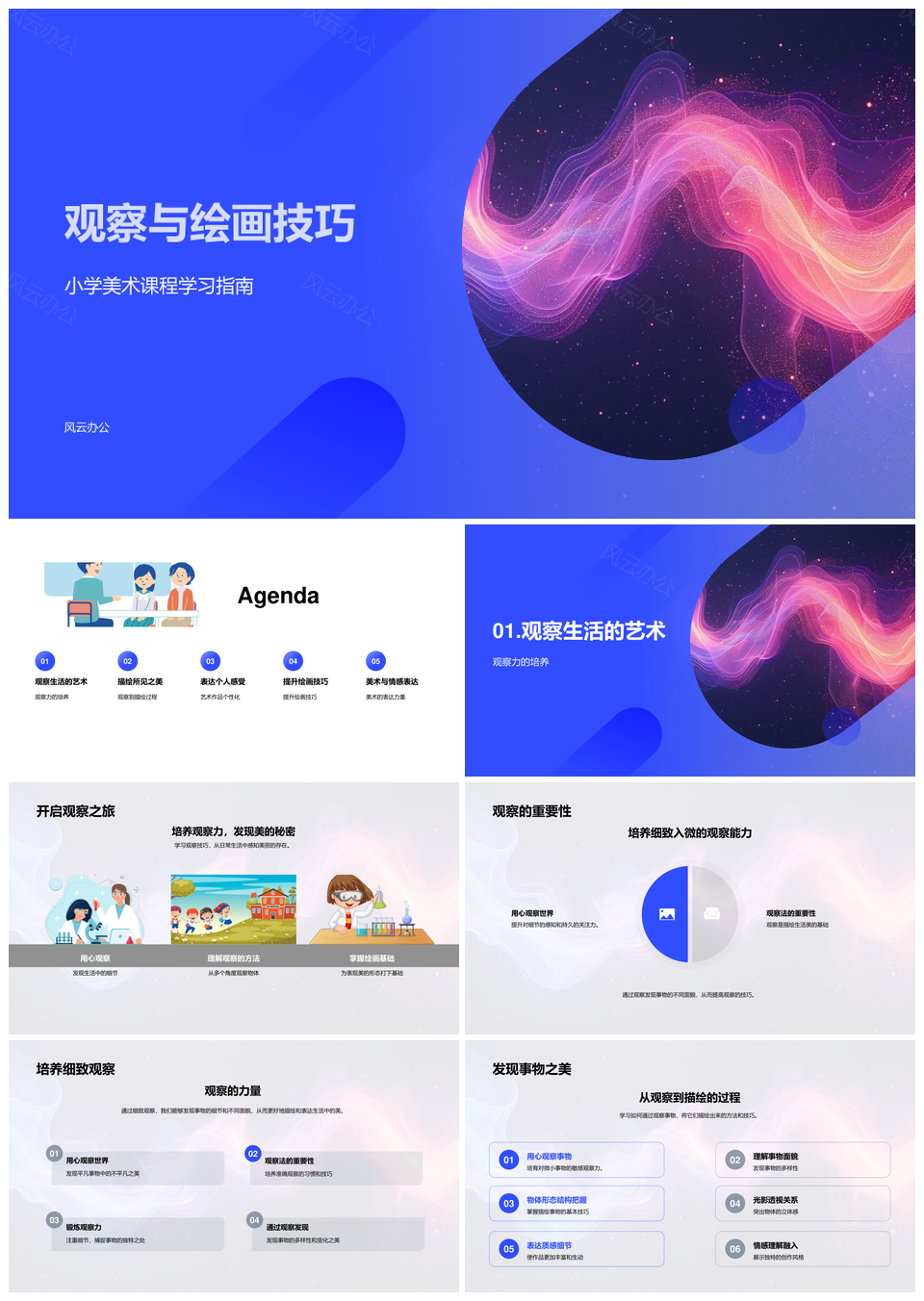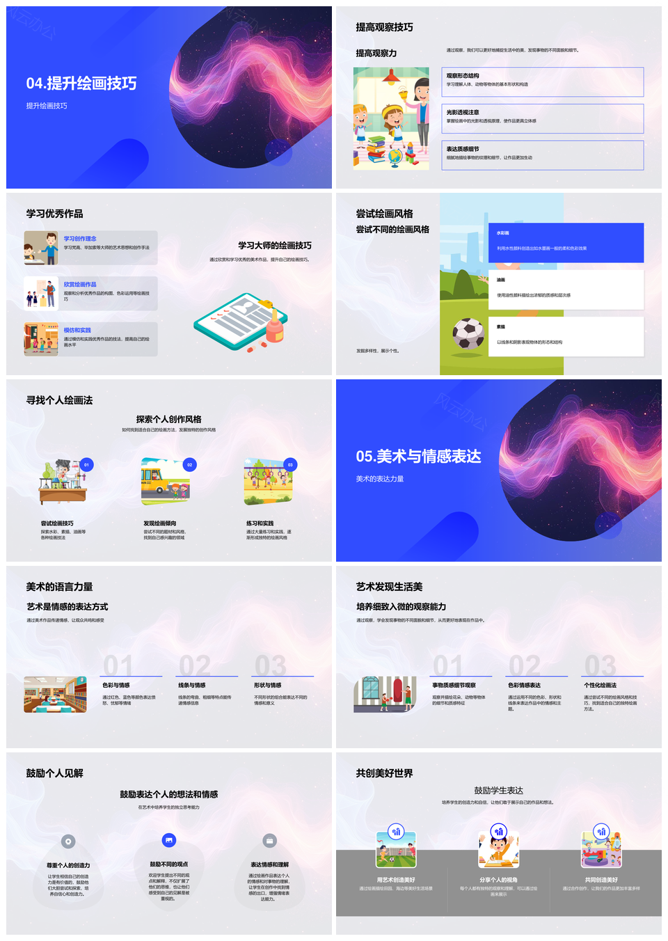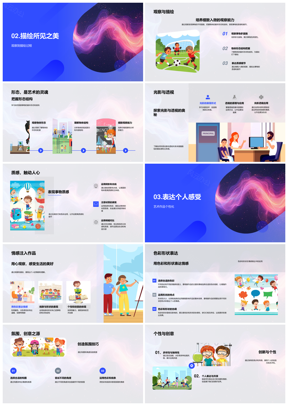 小学美术观察绘画形态光影质感色彩技巧PPT模板推荐