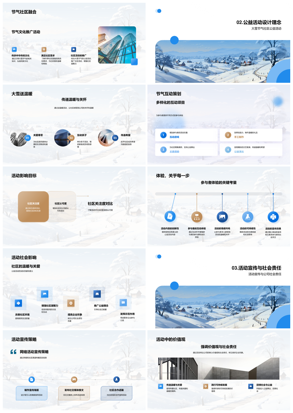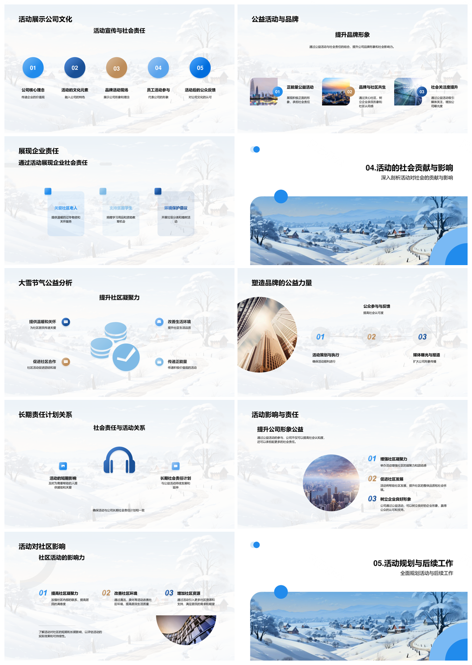 风云办公提供的大雪企业公益暖社区责任传温情扬品牌PPT模板,下载格式为pptx,一共33页,作品中文字及图均可以修改和编辑,图片更改请在作品中右键图片并更换,文字修改请直接点击文字进行修改。