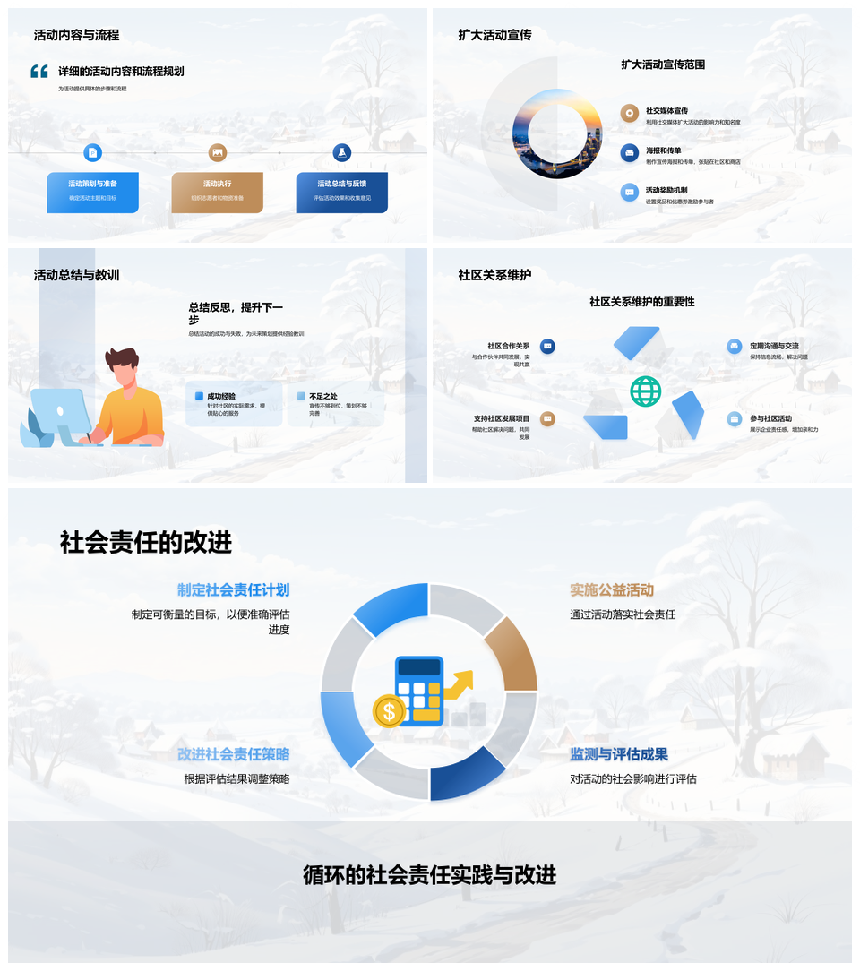 这是一张大雪企业公益暖社区责任传温情扬品牌PPT模板,包含大雪、企业、公益、暖社区、责任、传温情、扬品牌等主题内容,也可用作大雪企业公益社区、企业公益社区责任、公益社区责任温情、社区责任温情品牌、大雪企业公益责任、企业公益责任温情、公益责任温情品牌、大雪公益社区责任、公益社区温情品牌、企业社区责任温情、大雪企业公益、企业公益社区、公益社区责任、社区责任温情、责任温情品牌等PPT场景使用。