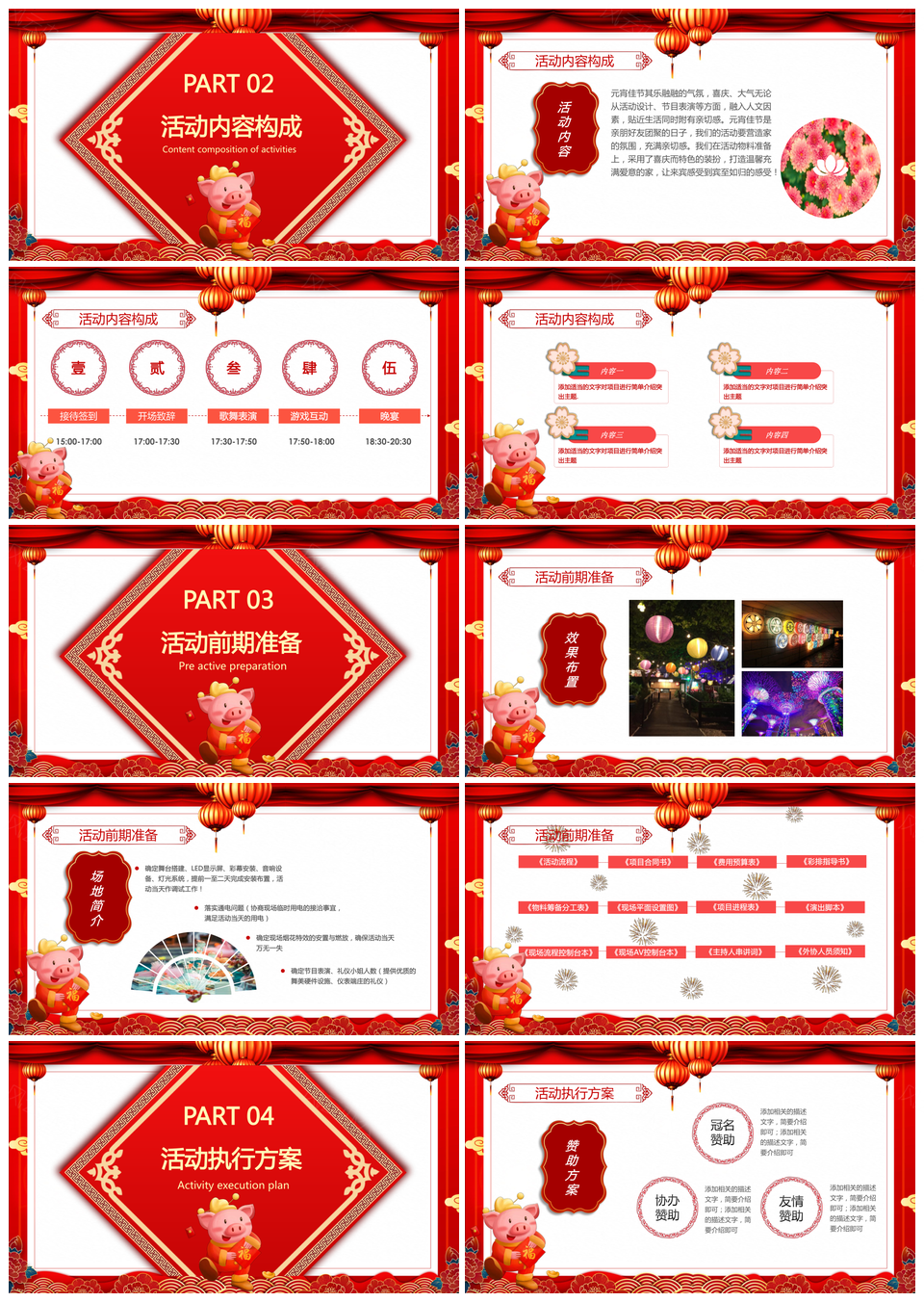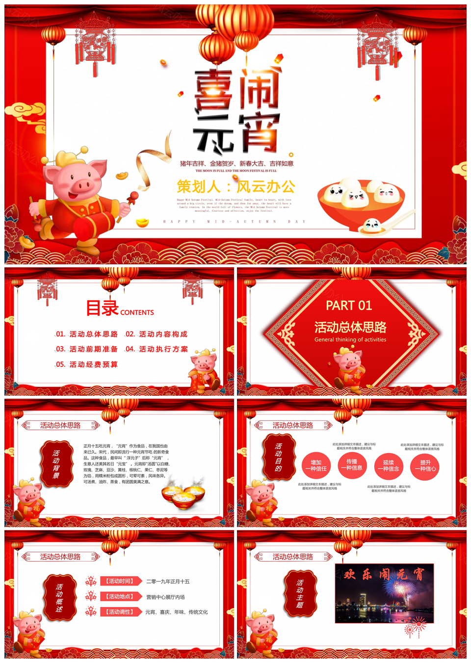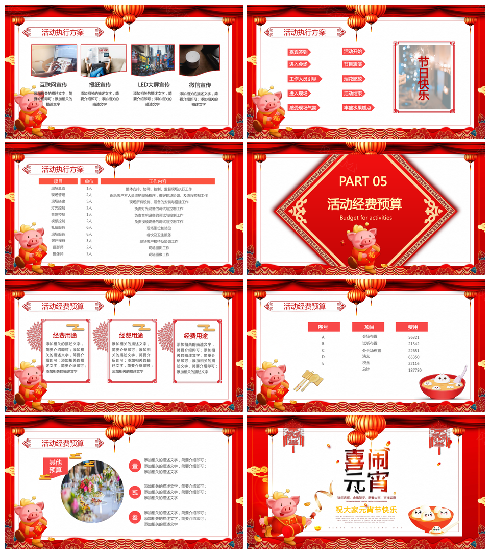 这是一张红色喜闹元宵活动策划PPT模板,包含红色、喜闹、元宵、活动策划等主题内容,也可用作红色、喜闹、元宵、活动、策划 红色喜闹元宵活动、喜闹元宵活动策划、红色元宵活动策划、喜闹元宵活动、元宵活动策划、红色喜闹元宵、红色活动策划、红色喜闹、喜闹元宵、元宵活动、活动策划、红色元宵、红色活动等PPT场景使用。 风云办公提供的红色喜闹元宵活动策划PPT模板,下载格式为pptx,一共24页,作品中文字及图均可以修改和编辑,图片更改请在作品中右键图片并更换,文字修改请直接点击文字进行修改。
