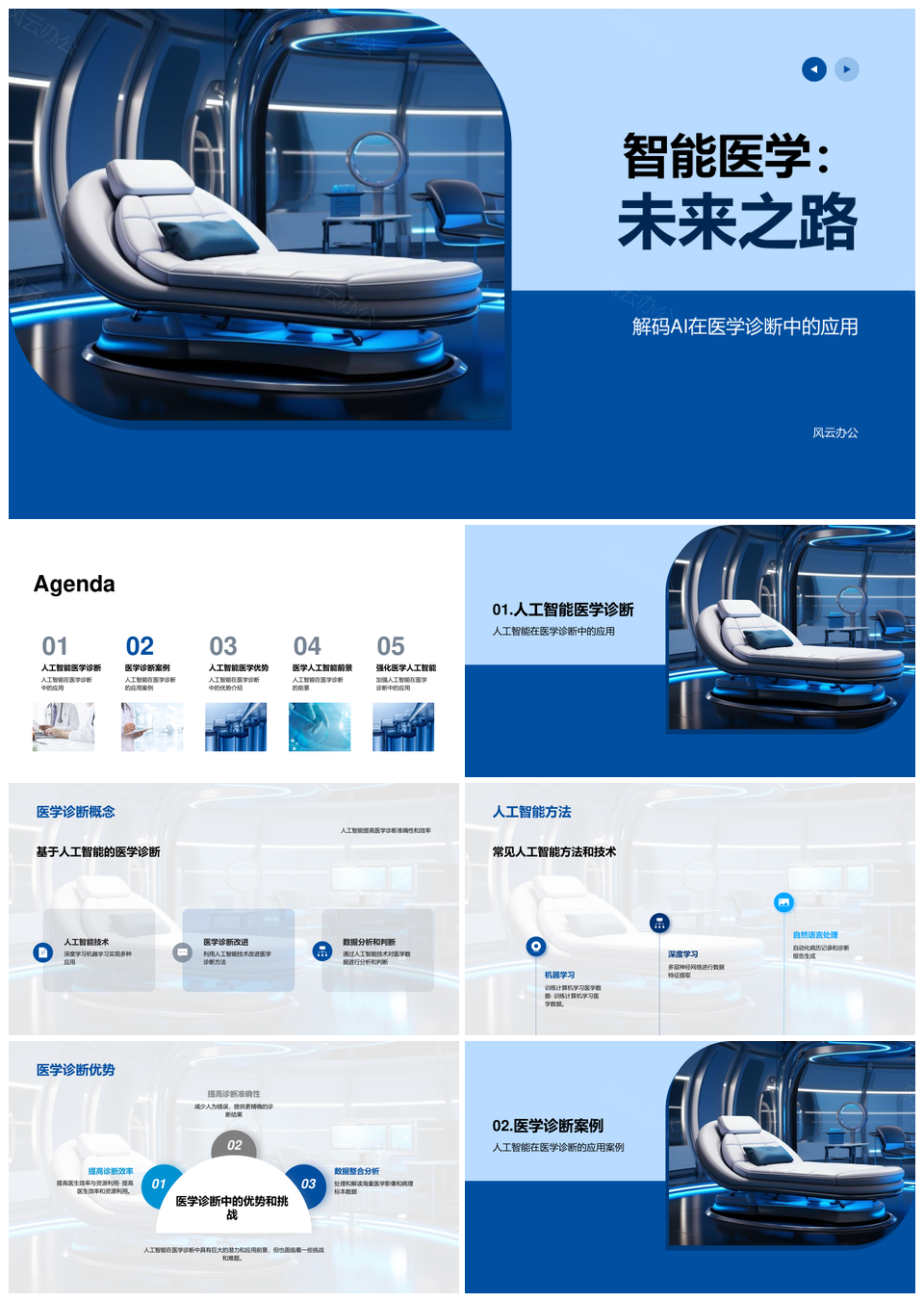 风云办公提供的人工智能医学诊断技术应用优势与未来PPT模板,下载格式为pptx,一共23页,作品中文字及图均可以修改和编辑,图片更改请在作品中右键图片并更换,文字修改请直接点击文字进行修改。