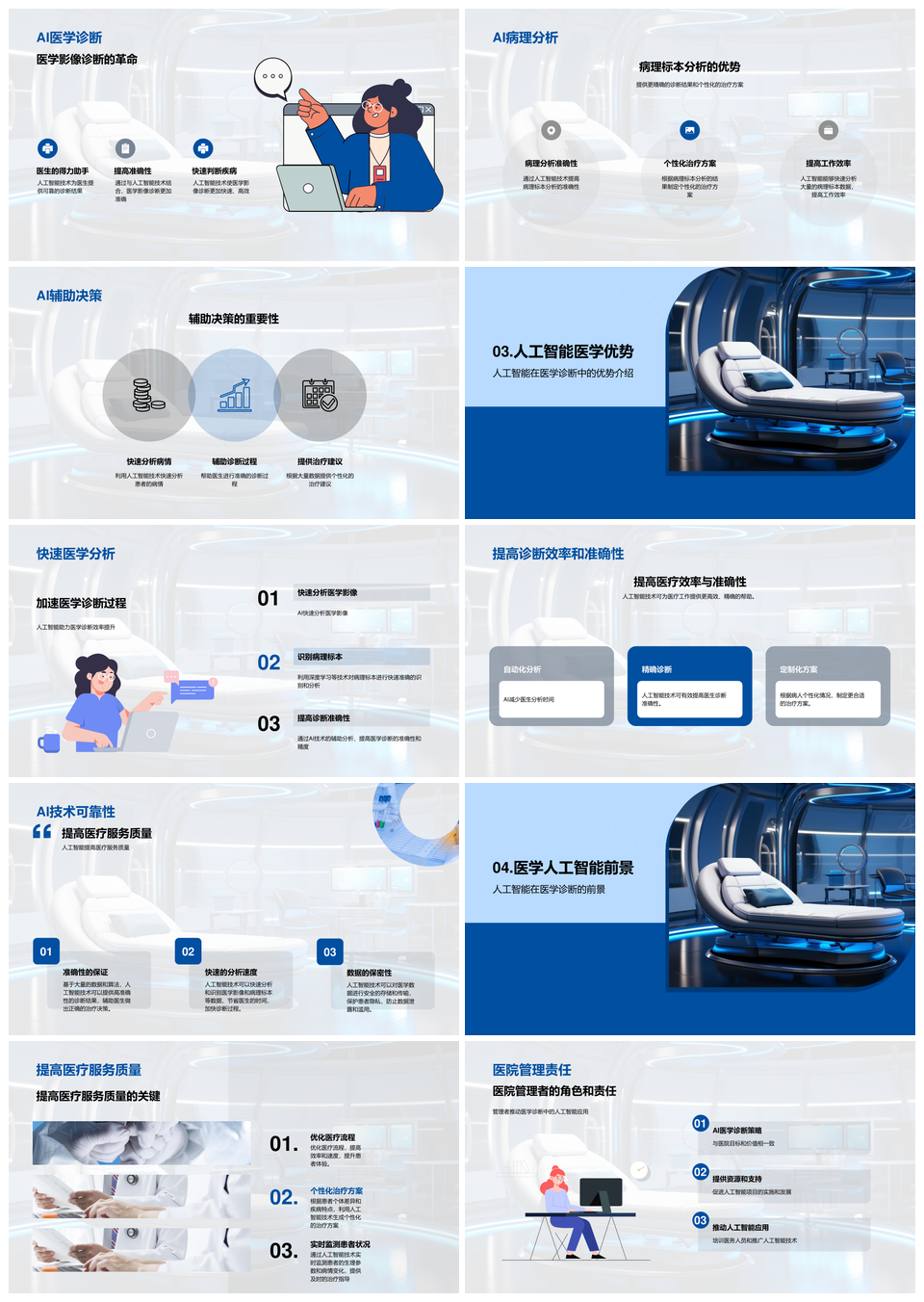 这是一张人工智能医学诊断技术应用优势与未来PPT模板,包含人工智能、医学诊断技术、应用优势、未来等主题内容,也可用作人工智能医学诊断技术应用优势、人工智能医学诊断技术应用、医学诊断技术应用优势未来、人工智能医学诊断技术、人工智能技术应用优势未来、医学诊断技术应用优势、人工智能医学诊断应用、医学诊断技术应用、技术应用优势未来、人工智能技术应用、诊断技术应用优势、医学诊断技术、应用优势未来、人工智能医学、技术应用优势、诊断技术优势等PPT场景使用。