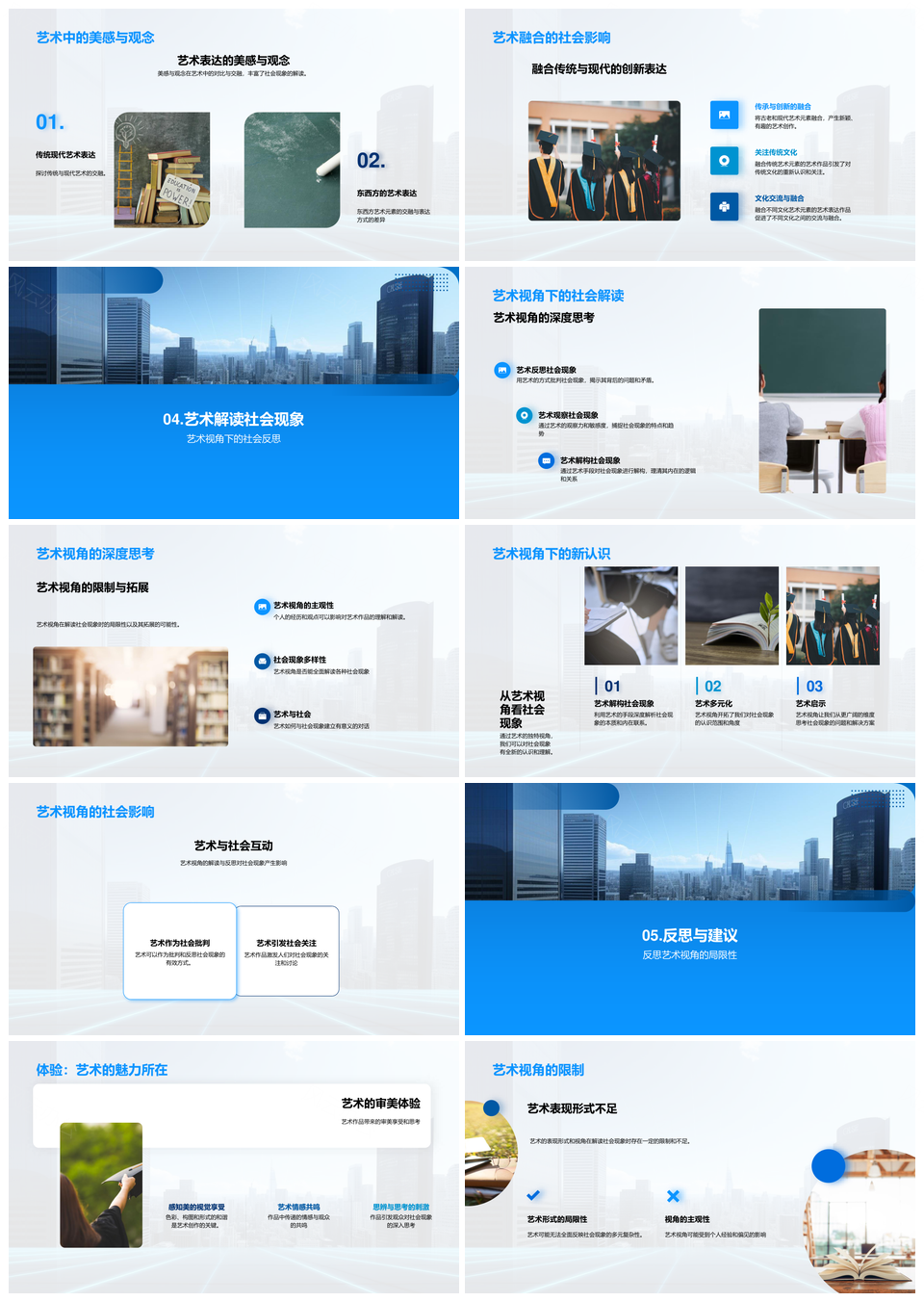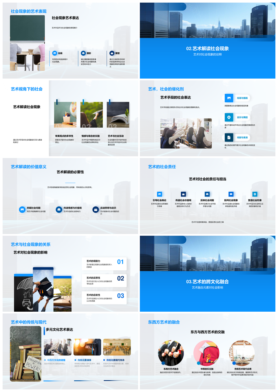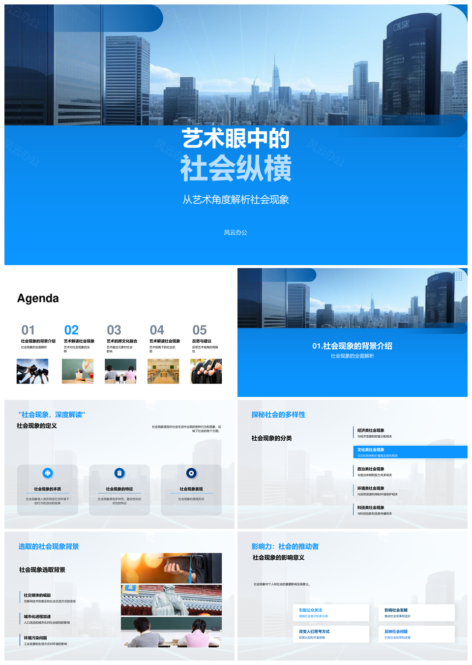 风云办公提供的艺术视角下的社会纵横与抽象审美PPT模板,下载格式为pptx,一共30页,作品中文字及图均可以修改和编辑,图片更改请在作品中右键图片并更换,文字修改请直接点击文字进行修改。