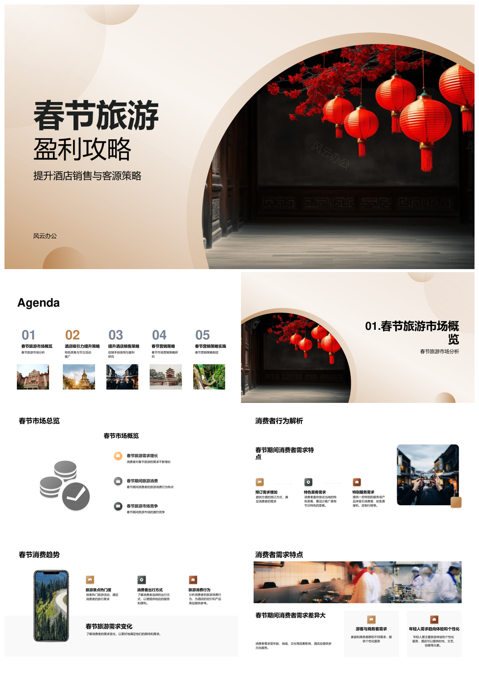 风云办公提供的春节旅游营销策略消费者需求盈利攻略PPT模板,下载格式为pptx,一共33页,作品中文字及图均可以修改和编辑,图片更改请在作品中右键图片并更换,文字修改请直接点击文字进行修改。