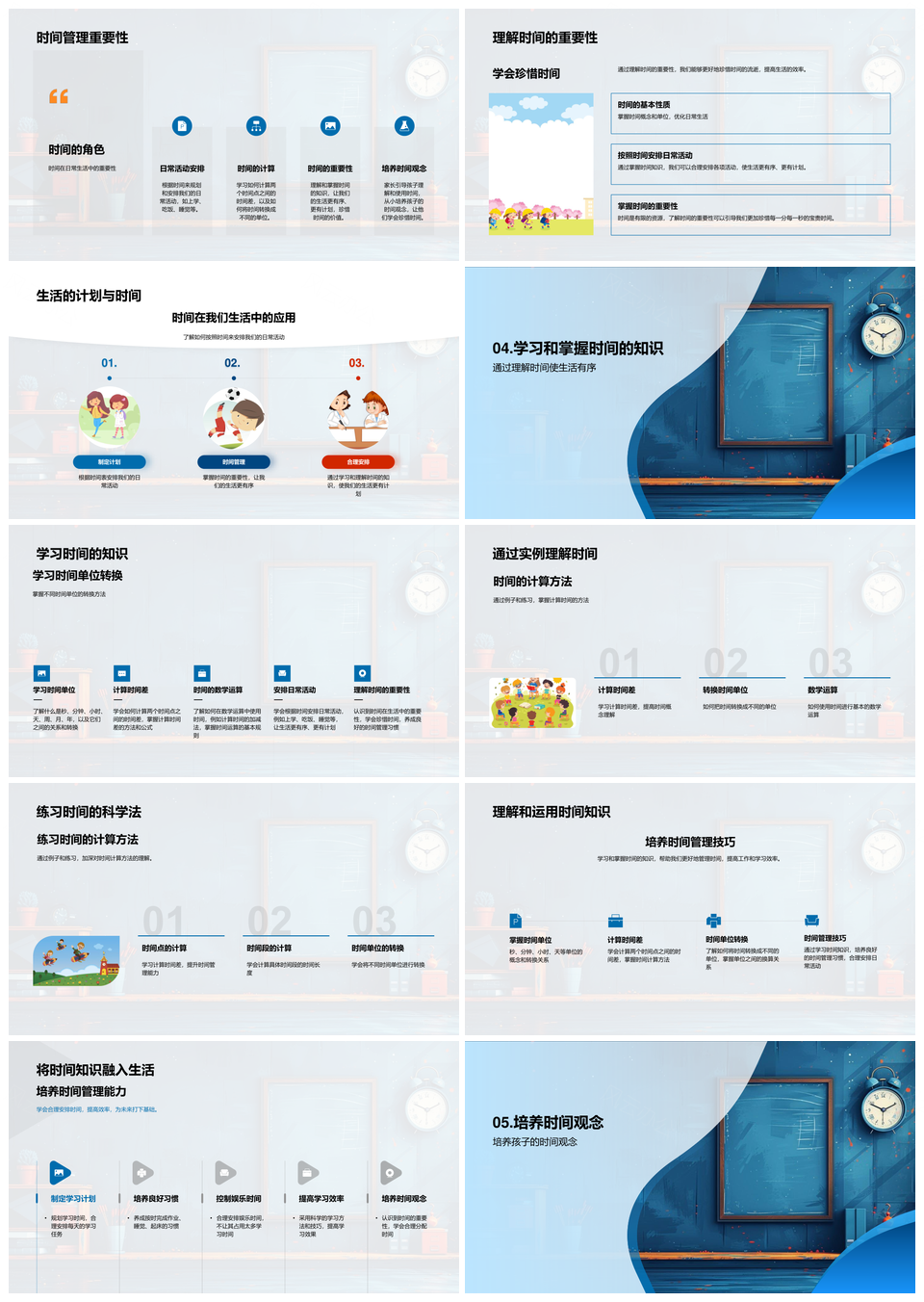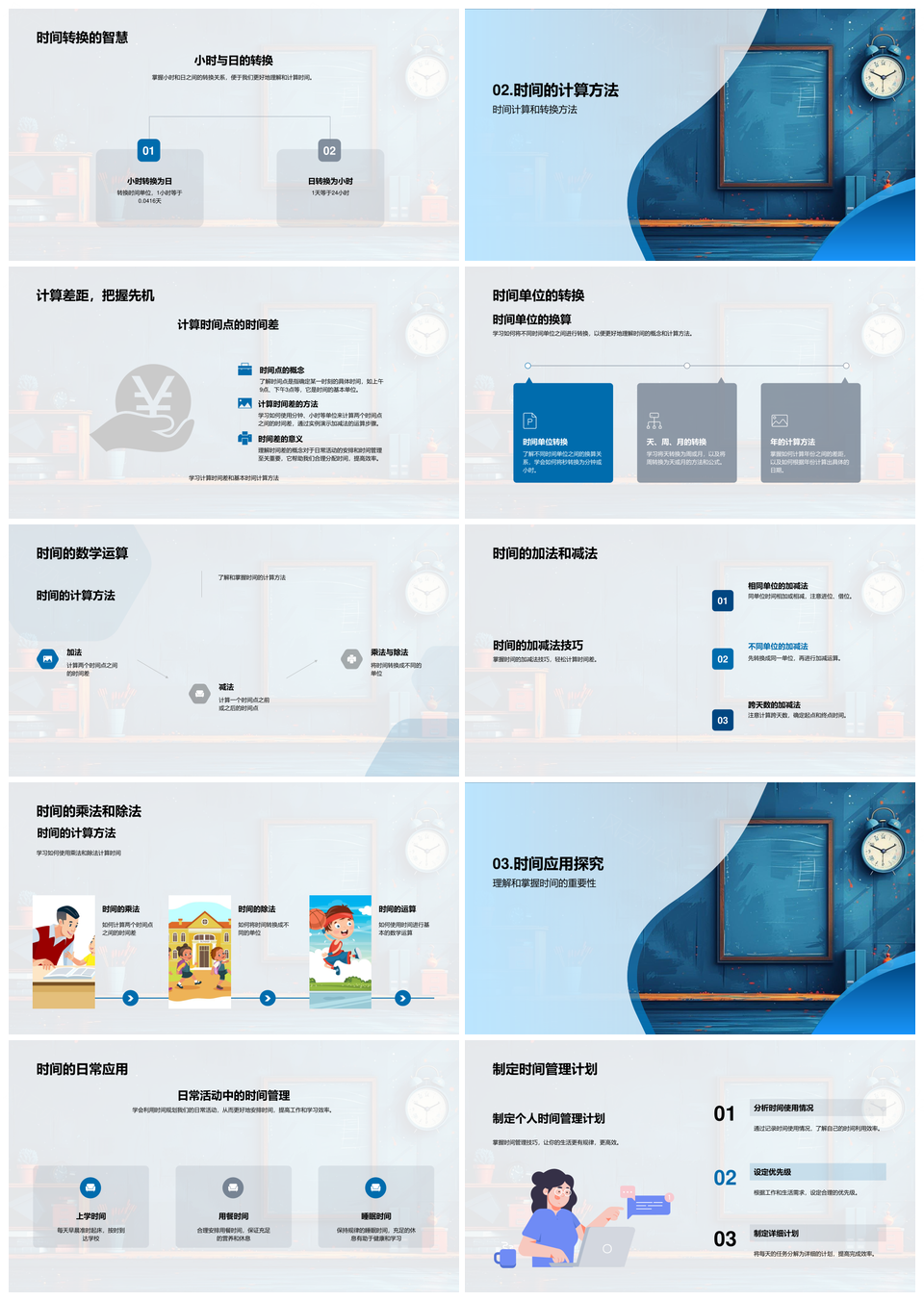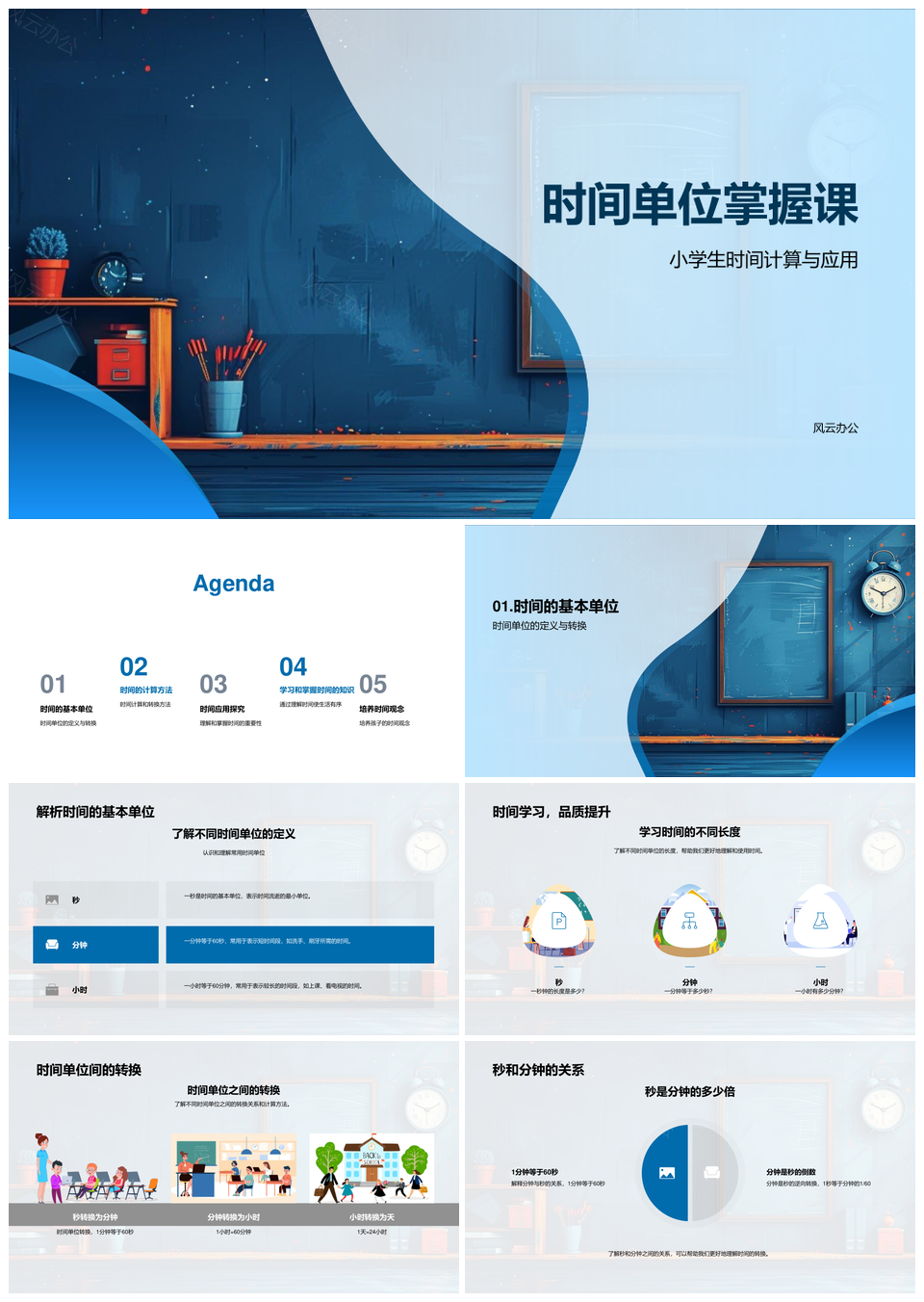 风云办公提供的小学生时间单位计算转换应用管理教学课件,下载格式为pptx,一共33页,作品中文字及图均可以修改和编辑,图片更改请在作品中右键图片并更换,文字修改请直接点击文字进行修改。