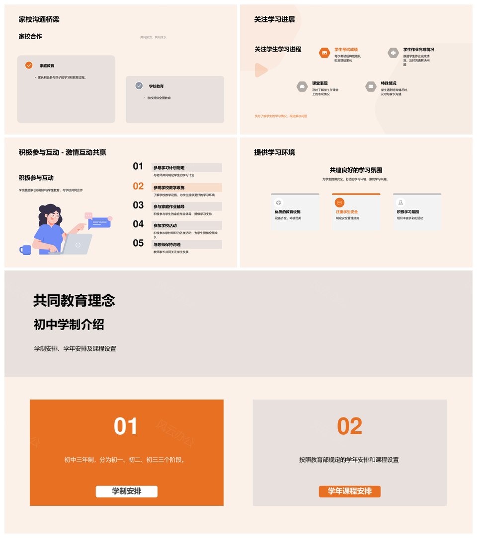 这是一张初一家长解读学制课程环境教学家校共育校园设施PPT模板,包含初一家长、学制、课程、环境、教学、家校共育、校园设施等主题内容,也可用作初一家长解读学制课程、家长解读学制课程环境、解读学制课程环境教学、学制课程环境教学家校、课程环境教学家校共育、环境教学家校共育校园、教学家校共育校园设施、家校共育校园设施、学制课程环境教学、课程环境教学家校、环境教学家校共育、教学家校共育校园、家校共育校园设施、家校共育校园、校园设施等PPT场景使用。 风云办公提供的初一家长解读学制课程环境教学家校共育校园设施PPT模板,下载格式为pptx,一共33页,作品中文字及图均可以修改和编辑,图片更改请在作品中右键图片并更换,文字修改请直接点击文字进行修改。
