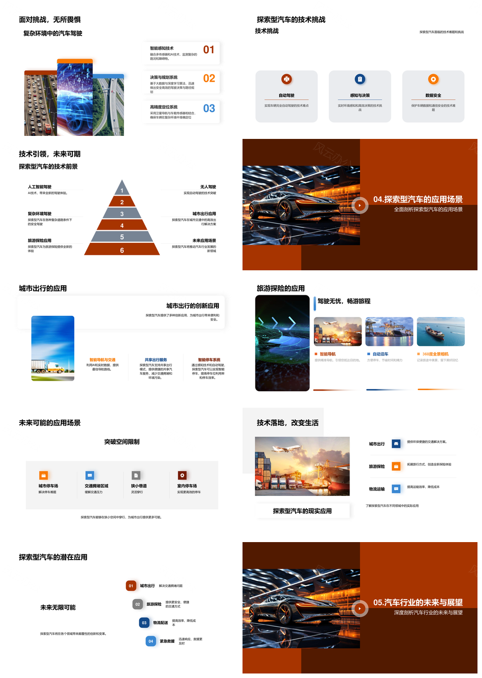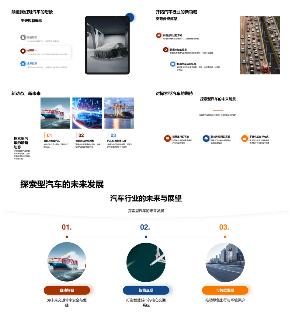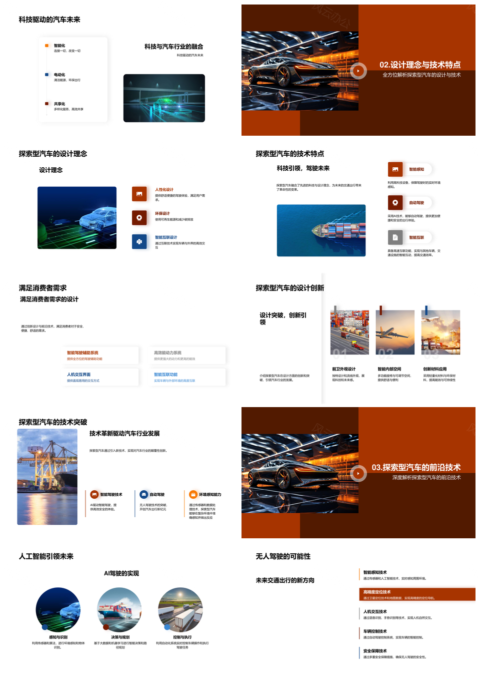 这是一张未来探索型汽车科技设计与AI无人驾驶需求PPT模板,包含未来、探索型、汽车科技、设计、AI、无人驾驶、需求等主题内容,也可用作未来探索型汽车科技设计、未来探索型汽车科技、未来探索型汽车设计、未来探索型科技设计、未来汽车科技设计、探索型汽车科技设计、未来汽车科技AI、汽车科技设计AI、科技设计AI无人驾驶、设计AI无人驾驶需求、未来探索型汽车、未来探索型科技、汽车科技设计、科技设计AI、AI无人驾驶需求等PPT场景使用。 风云办公提供的未来探索型汽车科技设计与AI无人驾驶需求PPT模板,下载格式为pptx,一共33页,作品中文字及图均可以修改和编辑,图片更改请在作品中右键图片并更换,文字修改请直接点击文字进行修改。