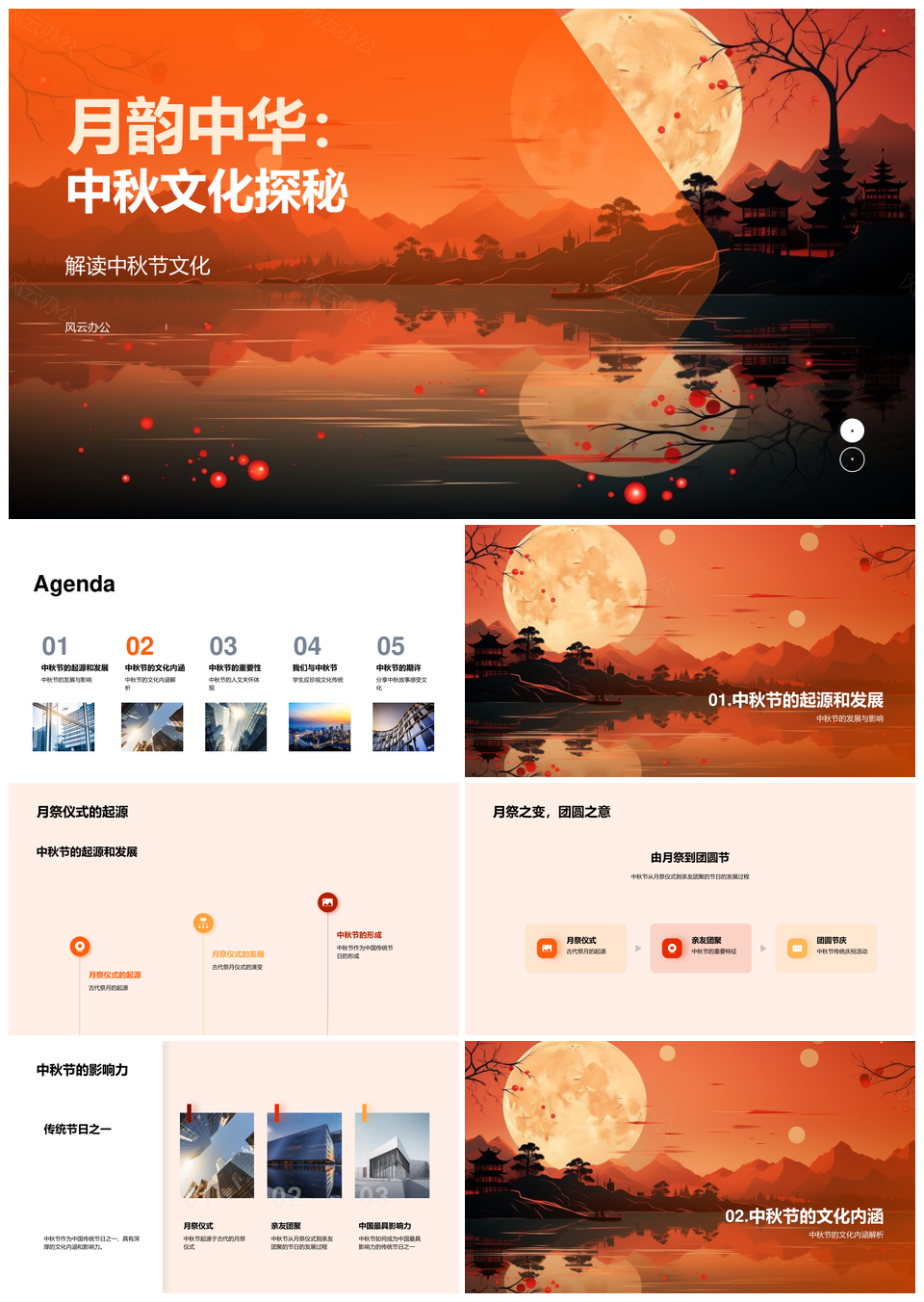 风云办公提供的中秋月祭团圆映照和谐文化探源PPT模板,下载格式为pptx,一共23页,作品中文字及图均可以修改和编辑,图片更改请在作品中右键图片并更换,文字修改请直接点击文字进行修改。