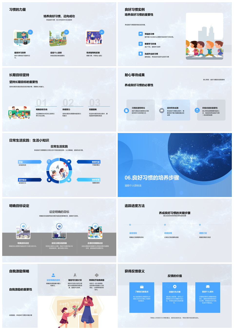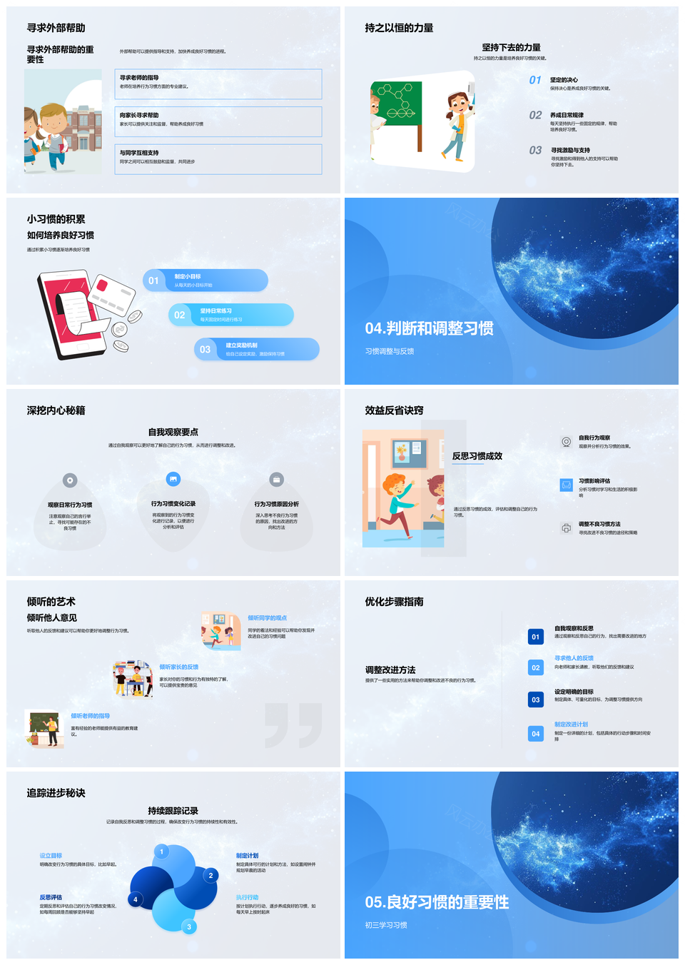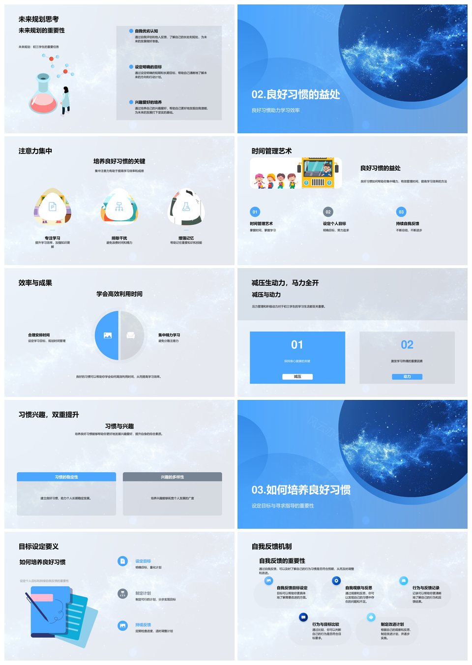风云办公提供的初三学生高效习惯养成提升学习效率PPT模板,下载格式为pptx,一共39页,作品中文字及图均可以修改和编辑,图片更改请在作品中右键图片并更换,文字修改请直接点击文字进行修改。