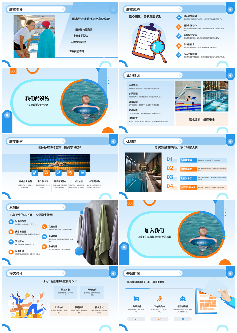 少儿成人游泳暑期培训专业教练安全技巧课程PPT模板推荐
