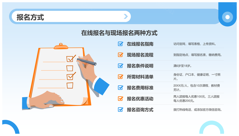 这是一张少儿成人游泳暑期培训专业教练安全技巧课程PPT模板,包含少儿、成人、游泳、暑期、培训、专业、教练、安全、技巧、课程等主题内容,也可用作成人游泳暑期培训、暑期培训专业教练、专业教练安全技巧、少儿成人游泳、成人游泳培训、游泳暑期培训、暑期培训专业、培训专业教练、专业教练安全、教练安全技巧、安全技巧课程、少儿暑期培训、暑期专业教练、专业教练、安全技巧等PPT场景使用。 风云办公提供的少儿成人游泳暑期培训专业教练安全技巧课程PPT模板,下载格式为pptx,一共19页,作品中文字及图均可以修改和编辑,图片更改请在作品中右键图片并更换,文字修改请直接点击文字进行修改。