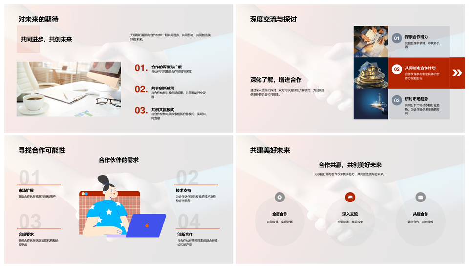 这是一张无极银行与合作伙伴战略合作共创未来PPT模板,包含无极银行、合作伙伴、战略、合作、共创、未来等主题内容,也可用作无极银行合作伙伴战略合作共创、合作伙伴战略合作共创未来、无极银行战略合作共创未来、无极银行合作伙伴战略合作、合作伙伴战略合作共创、战略合作共创未来、无极银行合作伙伴、合作伙伴战略合作、战略合作共创、共创未来、无极银行战略合作、战略合作未来、无极银行未来、合作伙伴共创未来、无极银行战略合作未来等PPT场景使用。