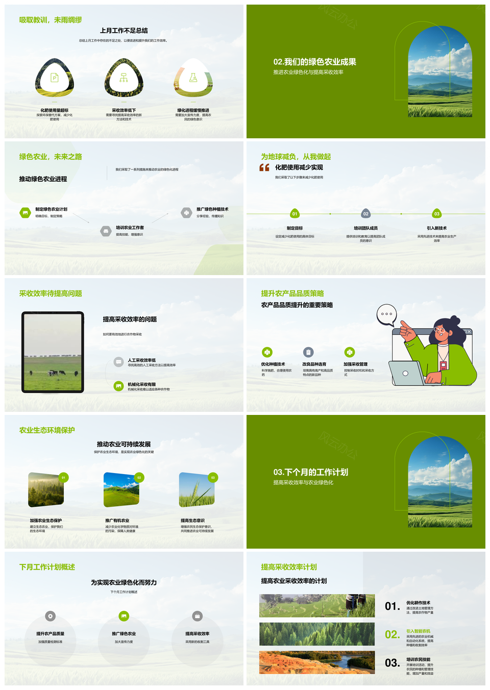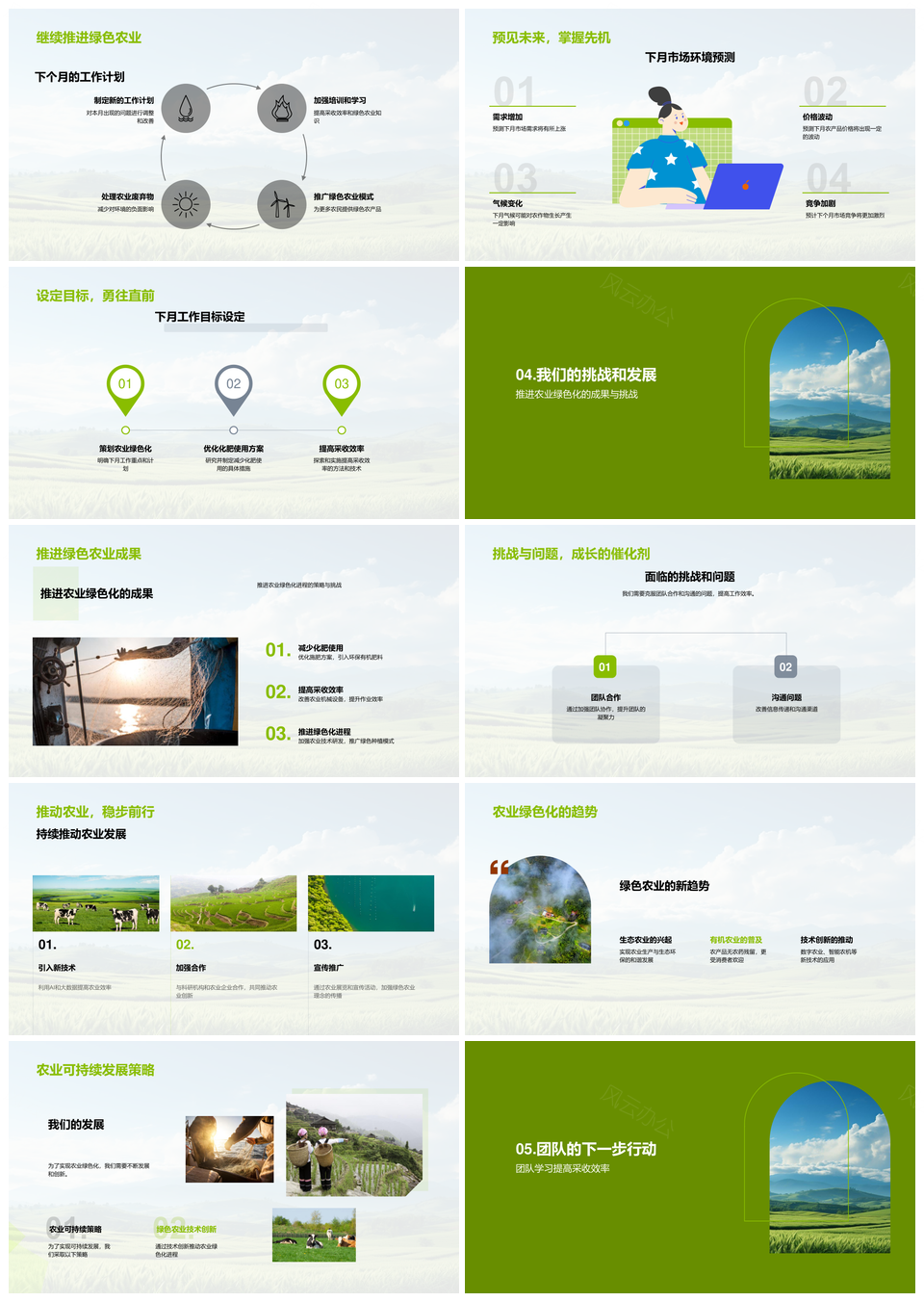 这是一张绿色农业减化肥提效护生态促可持续发展PPT模板,包含绿色农业、减化肥、提效、护生态、促可持续发展等主题内容,也可用作绿色农业减化肥提效护生态、绿色农业减化肥提效可持续发展、减化肥提效护生态可持续发展、绿色农业提效护生态可持续发展、绿色农业减化肥护生态可持续发展、绿色农业减化肥提效护、减化肥提效护生态、绿色农业提效护生态、绿色农业护生态可持续发展、减化肥护生态可持续发展、绿色农业减化肥、提效护生态、护生态可持续发展、绿色农业提效、减化肥提效等PPT场景使用。 风云办公提供的绿色农业减化肥提效护生态促可持续发展PPT模板,下载格式为pptx,一共33页,作品中文字及图均可以修改和编辑,图片更改请在作品中右键图片并更换,文字修改请直接点击文字进行修改。
