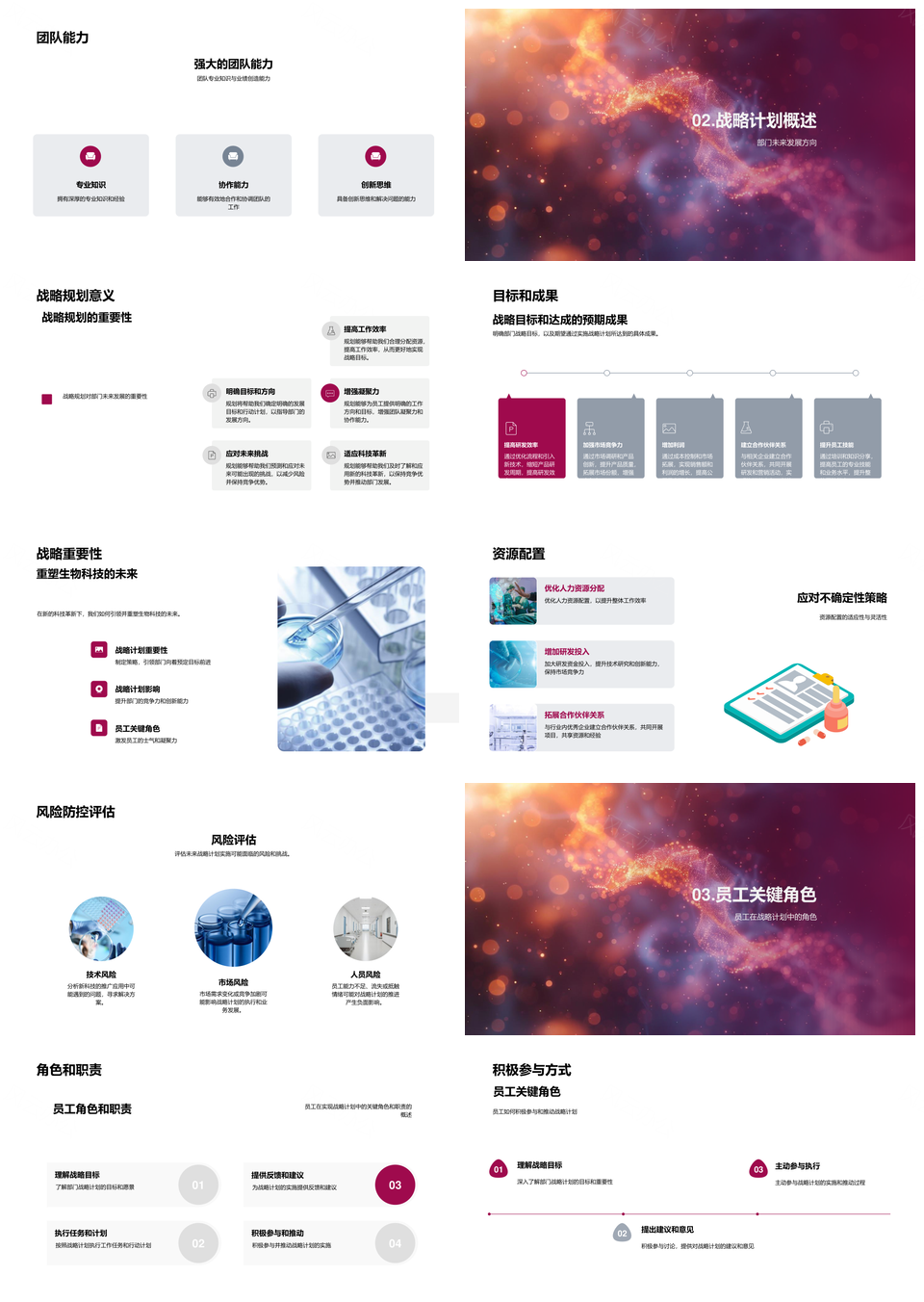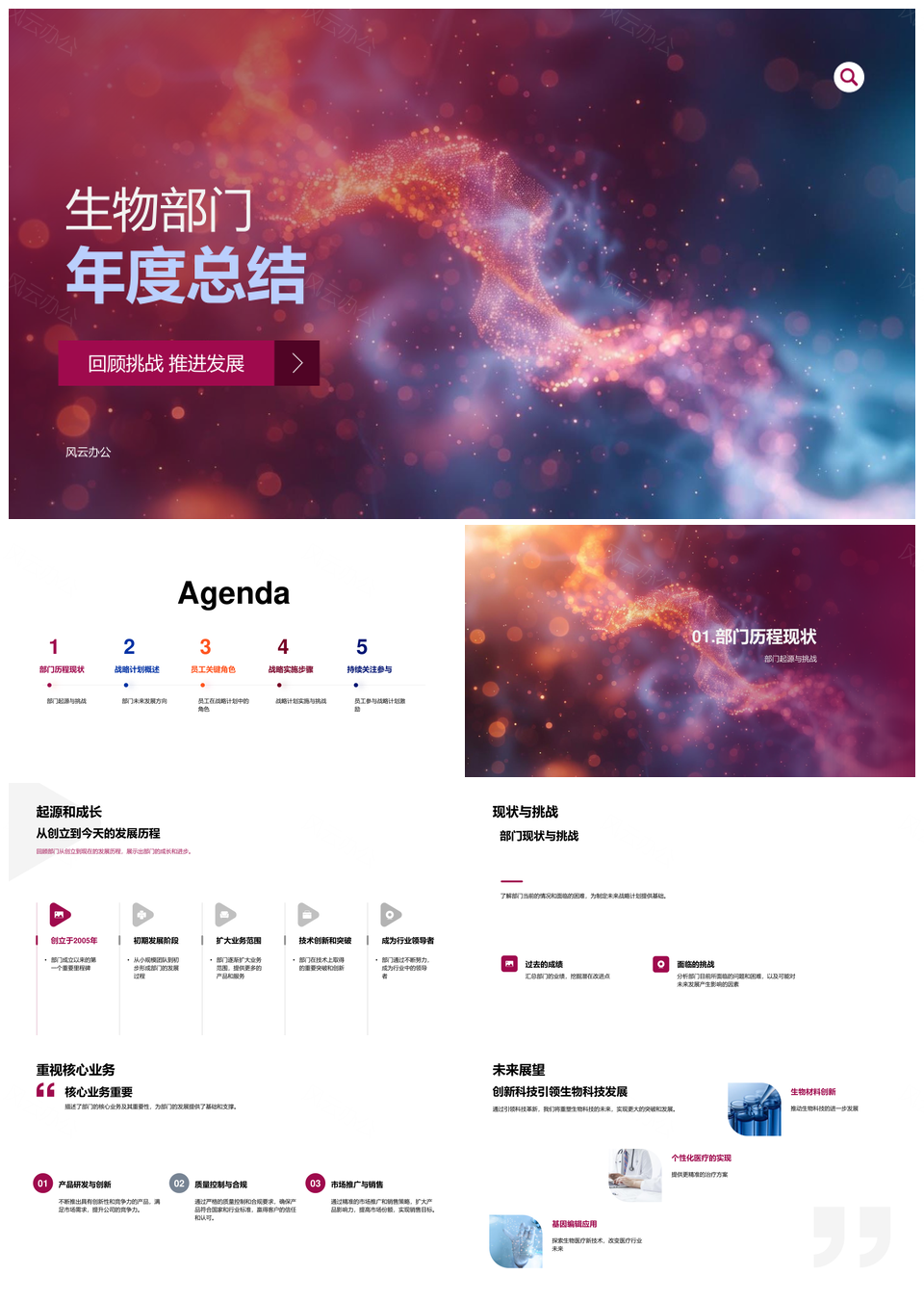 这是一张生物部门战略规划核心业务年度历程总结PPT模板,包含生物部门、战略规划、核心业务、年度历程、总结等主题内容,也可用作生物部门战略规划、战略规划核心业务、核心业务年度历程、业务年度历程总结、部门战略规划、规划核心业务、业务年度历程、年度历程总结、生物部门核心业务、战略规划年度历程、核心业务年度总结、部门战略核心、规划核心年度、业务年度核心、战略核心业务等PPT场景使用。 风云办公提供的生物部门战略规划核心业务年度历程总结PPT模板,下载格式为pptx,一共33页,作品中文字及图均可以修改和编辑,图片更改请在作品中右键图片并更换,文字修改请直接点击文字进行修改。