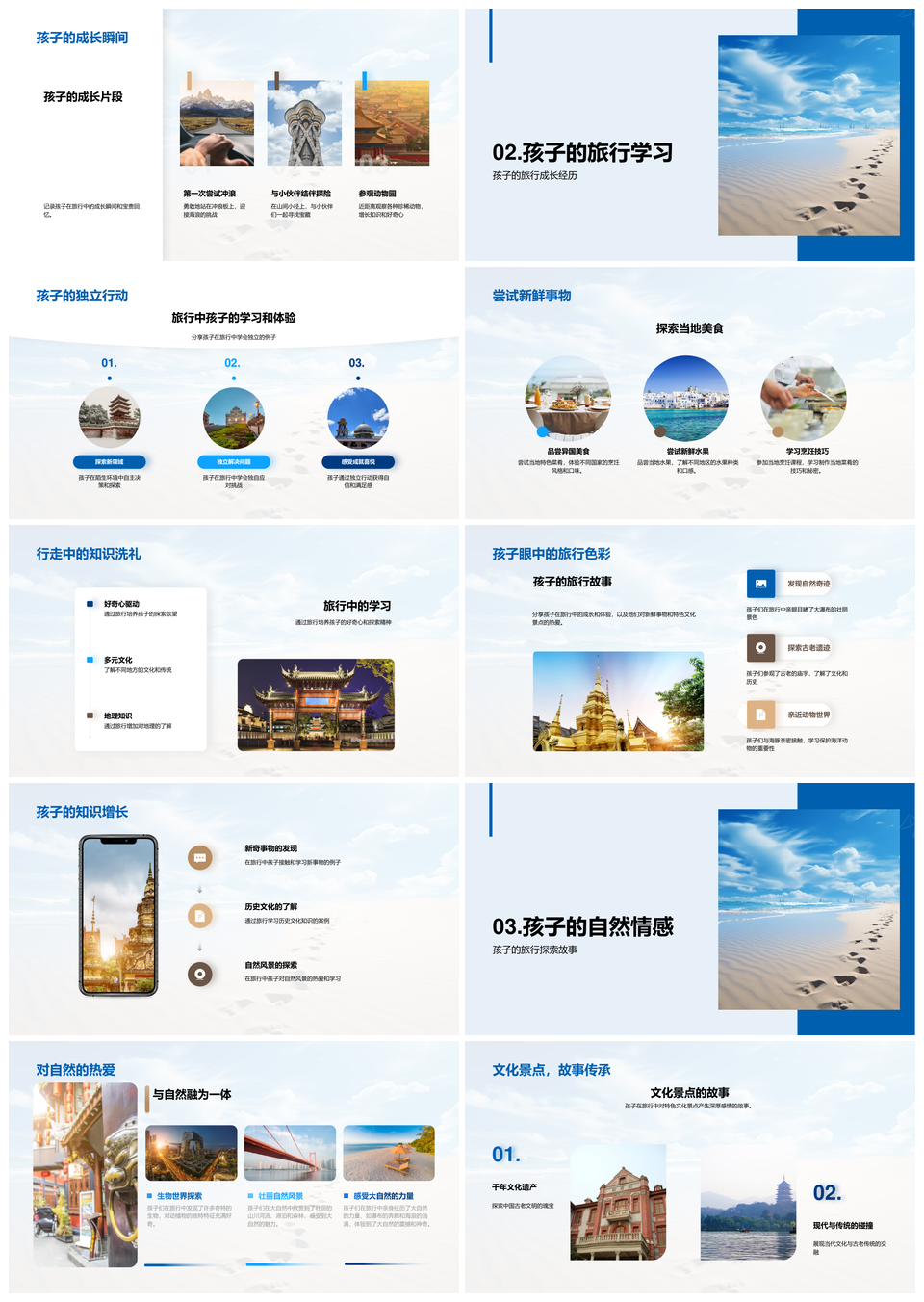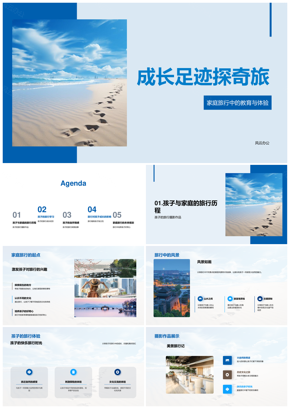 风云办公提供的亲子探奇沙滩足迹学旅成长PPT模板,下载格式为pptx,一共33页,作品中文字及图均可以修改和编辑,图片更改请在作品中右键图片并更换,文字修改请直接点击文字进行修改。