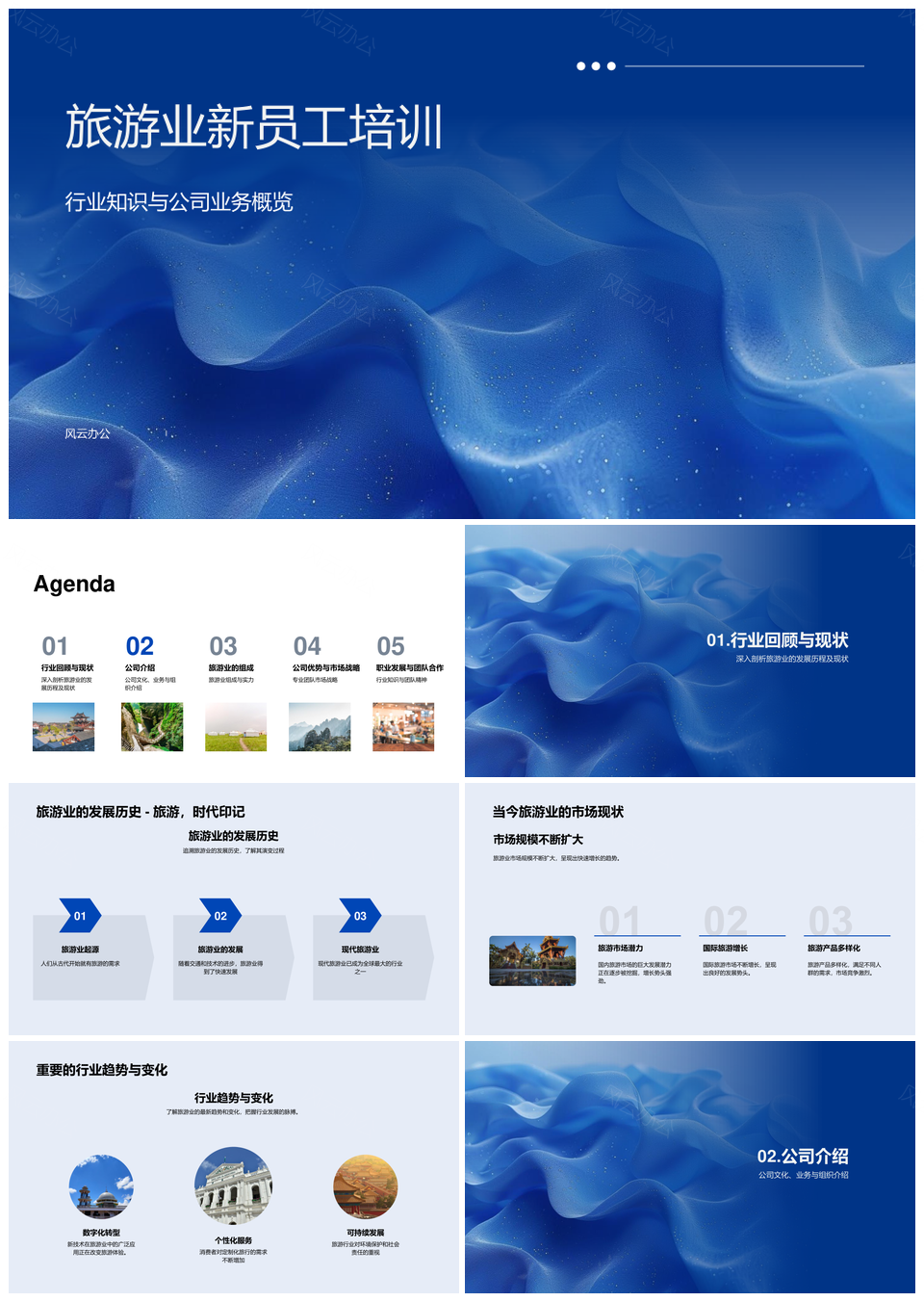 风云办公提供的旅游业发展历史趋势与文化新员工培训PPT模板,下载格式为pptx,一共23页,作品中文字及图均可以修改和编辑,图片更改请在作品中右键图片并更换,文字修改请直接点击文字进行修改。