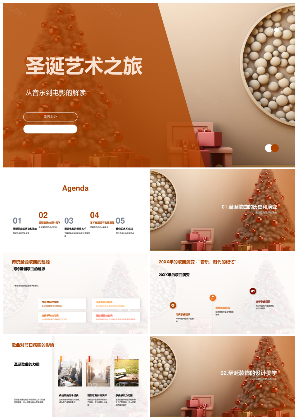 风云办公提供的圣诞树音乐电影装饰创意艺术之旅PPT模板,下载格式为pptx,一共23页,作品中文字及图均可以修改和编辑,图片更改请在作品中右键图片并更换,文字修改请直接点击文字进行修改。