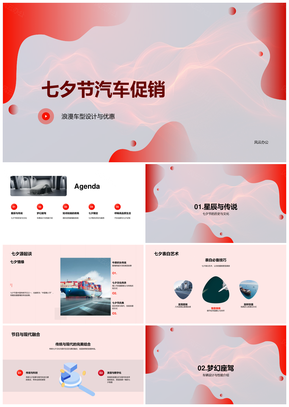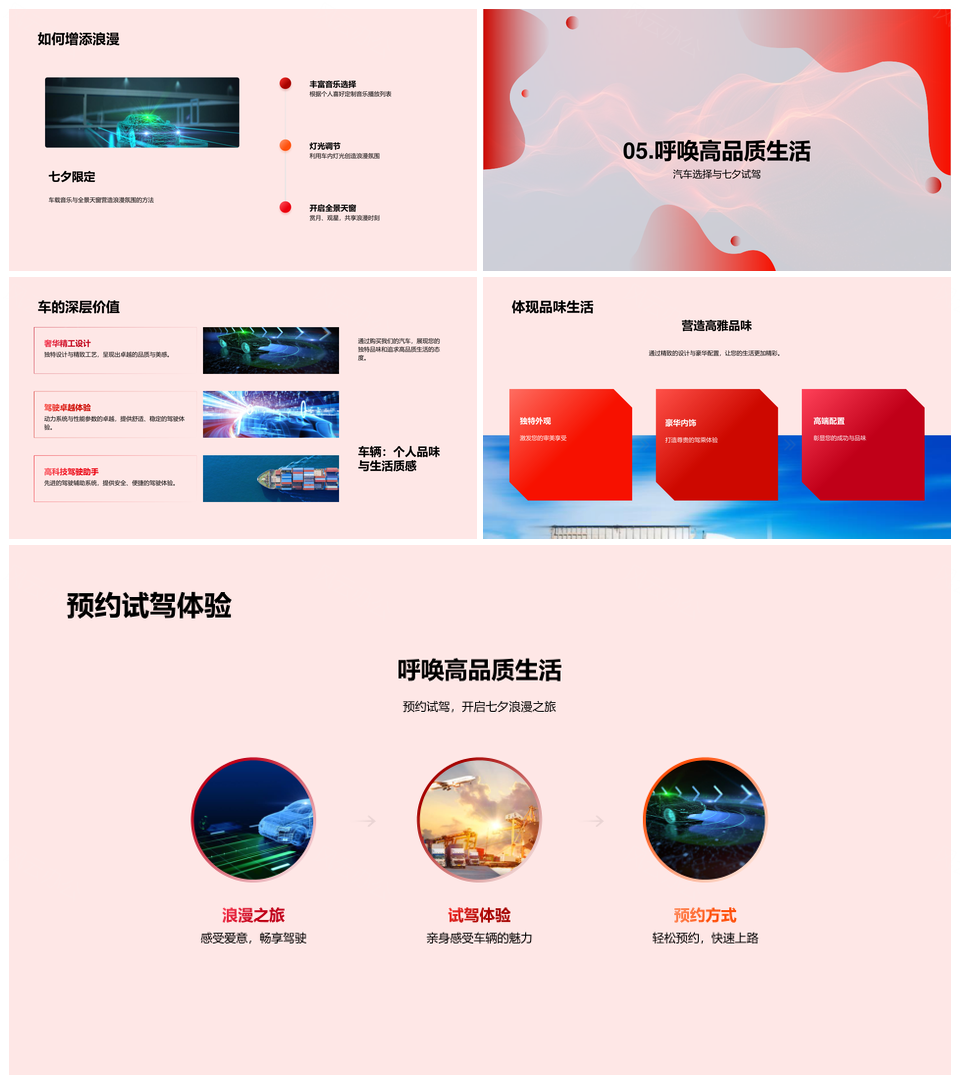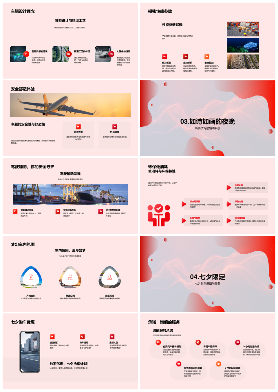 这是一张七夕浪漫车型促销设计性能安全环保购车优惠PPT模板,包含七夕、浪漫车型、促销、设计、性能、安全、环保、购车优惠等主题内容,也可用作七夕浪漫车型促销、设计性能安全环保、安全环保购车优惠、七夕浪漫车型、浪漫车型促销、性能安全环保、安全环保购车、环保购车优惠、七夕浪漫、浪漫车型、车型促销、促销设计、设计性能、性能安全、安全环保等PPT场景使用。 风云办公提供的七夕浪漫车型促销设计性能安全环保购车优惠PPT模板,下载格式为pptx,一共23页,作品中文字及图均可以修改和编辑,图片更改请在作品中右键图片并更换,文字修改请直接点击文字进行修改。