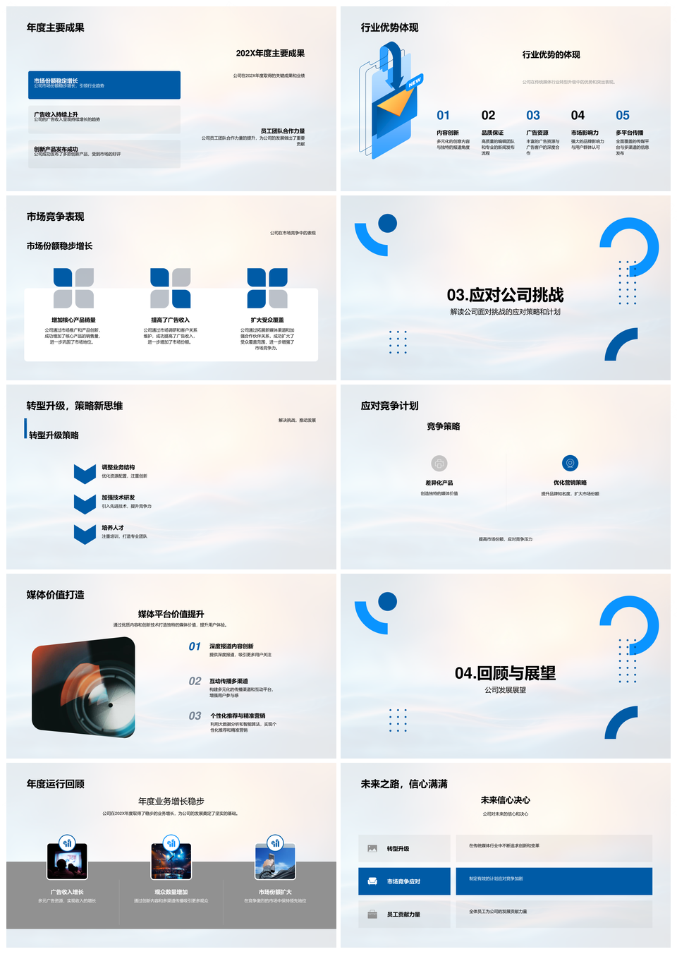 这是一张2025传媒业数字媒体趋势展望业绩回顾升级策略PPT模板,包含2025、传媒业、数字媒体、趋势、展望、业绩、回顾、升级、策略等主题内容,也可用作2025传媒业数字媒体趋势展望、传媒业数字媒体趋势展望业绩、数字媒体趋势展望业绩回顾、趋势展望业绩回顾升级、展望业绩回顾升级策略、2025传媒业数字媒体趋势、传媒业数字媒体趋势展望业绩、数字媒体趋势展望业绩回顾、趋势展望业绩回顾升级、展望业绩回顾升级策略、2025传媒业数字媒体、传媒业数字媒体趋势、数字媒体趋势展望、趋势展望业绩、业绩回顾升级等PPT场景使用。 风云办公提供的2025传媒业数字媒体趋势展望业绩回顾升级策略PPT模板,下载格式为pptx,一共23页,作品中文字及图均可以修改和编辑,图片更改请在作品中右键图片并更换,文字修改请直接点击文字进行修改。