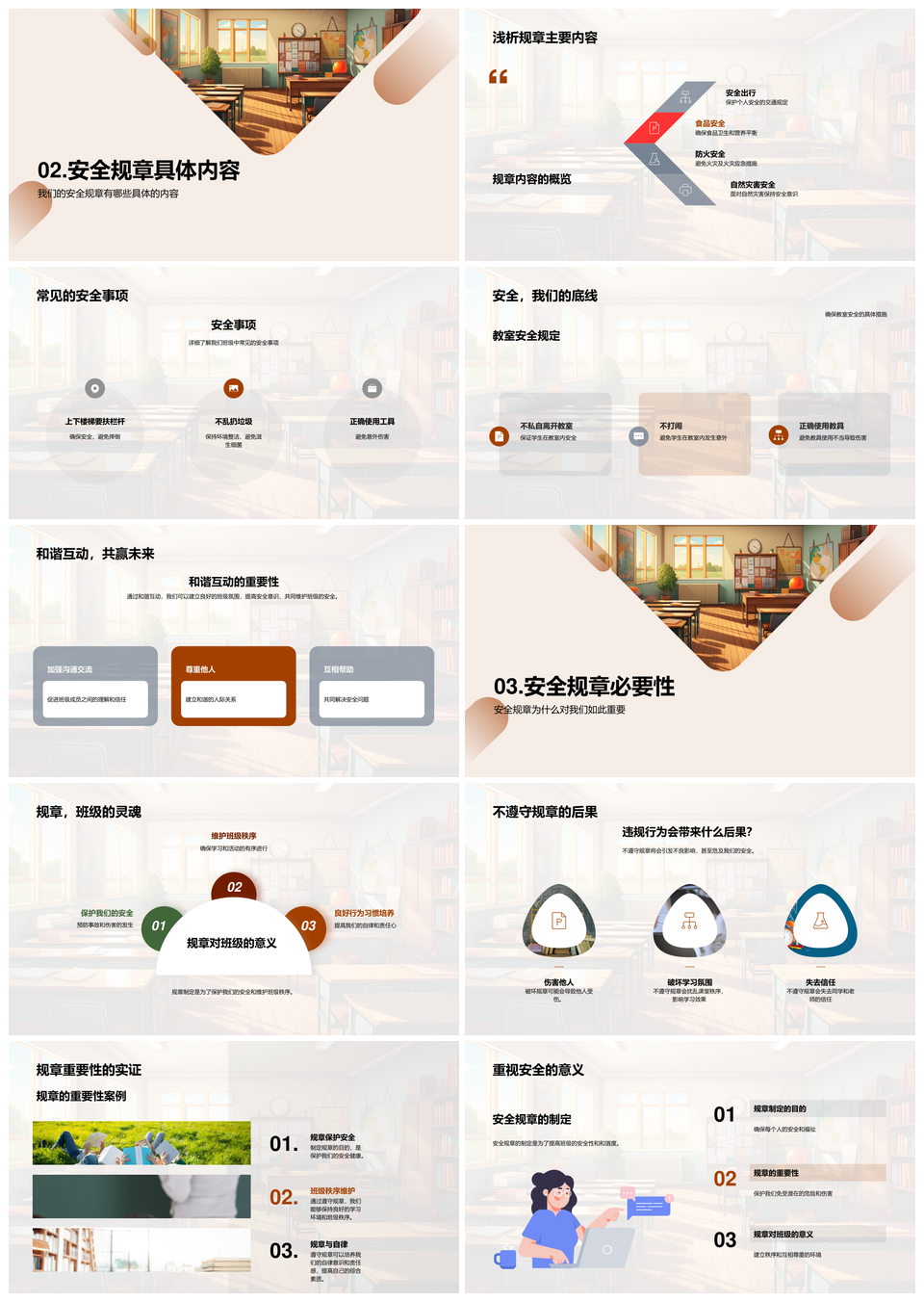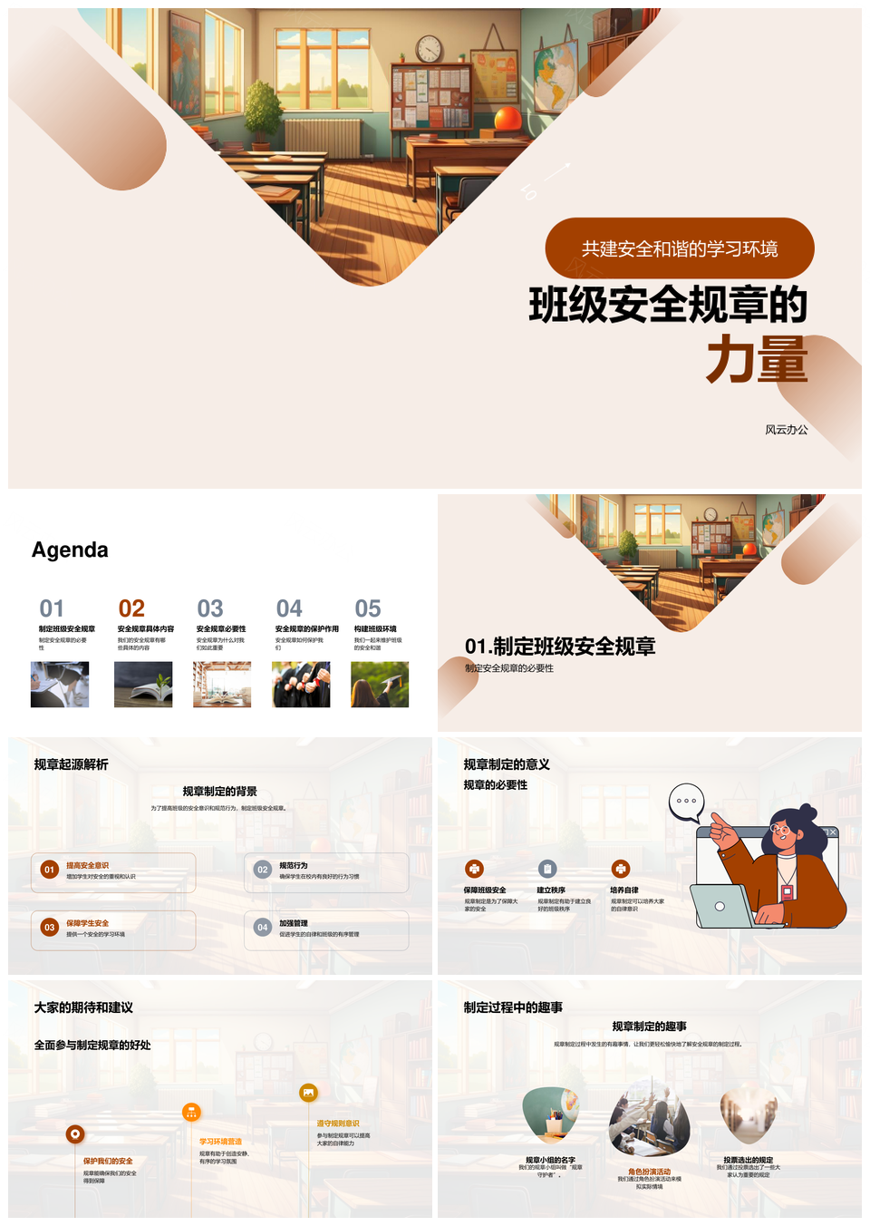这是一张班级安全规章制定遵守保障教室安全学习环境PPT模板,包含班级、安全规章、制定、遵守、保障、教室、安全、学习、环境等主题内容,也可用作班级安全规章制定、保障教室安全学习、教室安全学习环境、遵守保障教室安全、班级安全规章、保障教室安全、教室安全学习、安全学习环境、班级安全、安全规章、教室安全、安全学习、学习环境、班级规章、制定保障等PPT场景使用。 风云办公提供的班级安全规章制定遵守保障教室安全学习环境PPT模板,下载格式为pptx,一共28页,作品中文字及图均可以修改和编辑,图片更改请在作品中右键图片并更换,文字修改请直接点击文字进行修改。