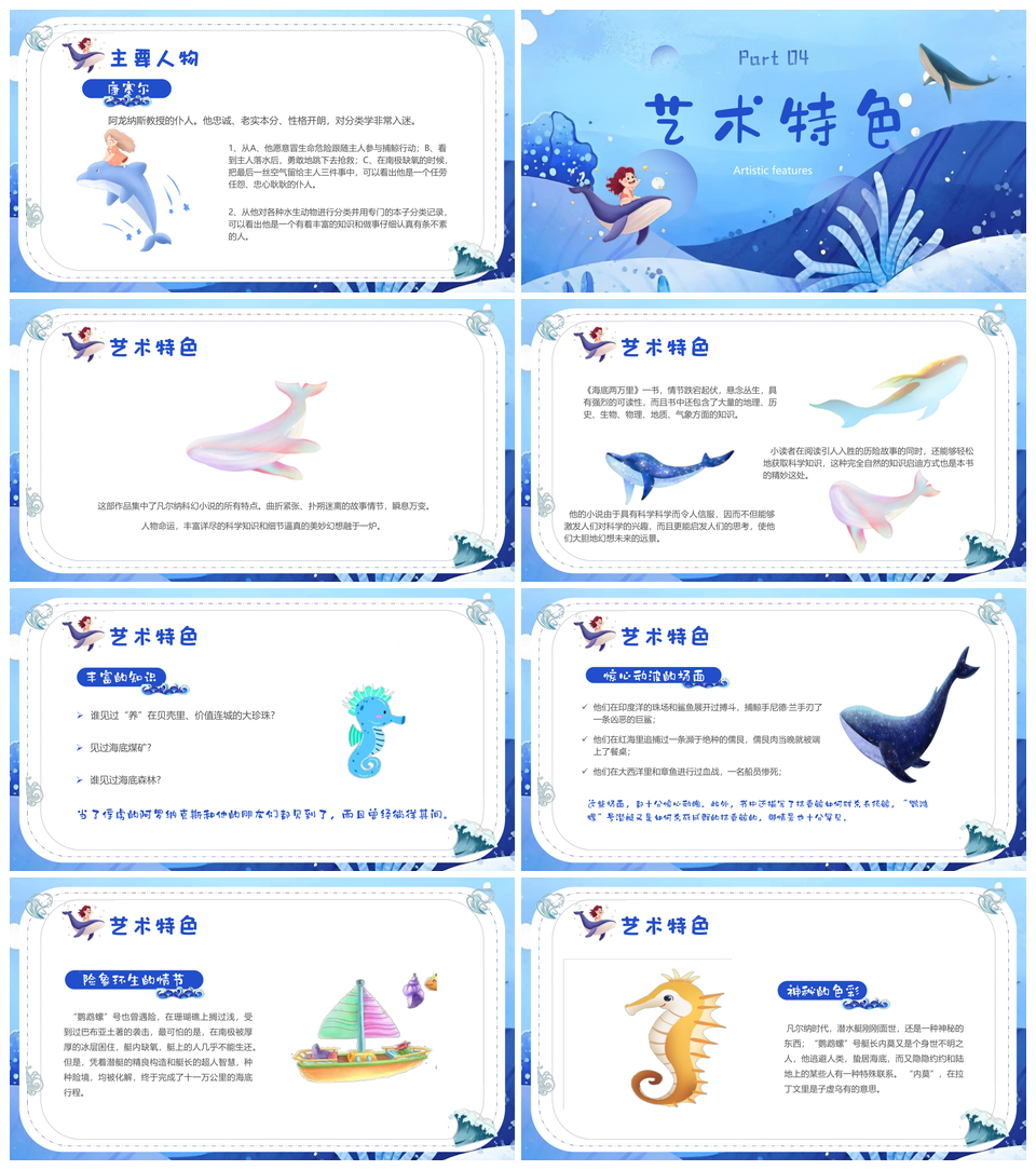 海底两万里蓝色水彩小清新教师读书分享说课PPT模板推荐