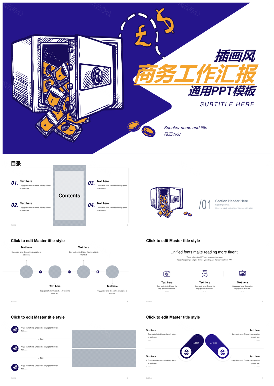 风云办公提供的蓝色商务插画风金融工作汇报PPT模板,下载格式为pptx,一共37页,作品中文字及图均可以修改和编辑,图片更改请在作品中右键图片并更换,文字修改请直接点击文字进行修改。