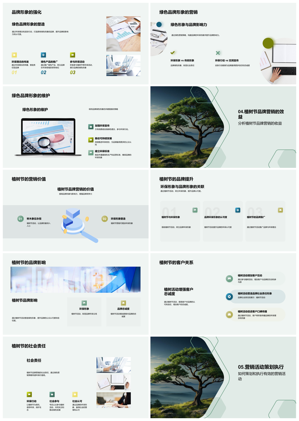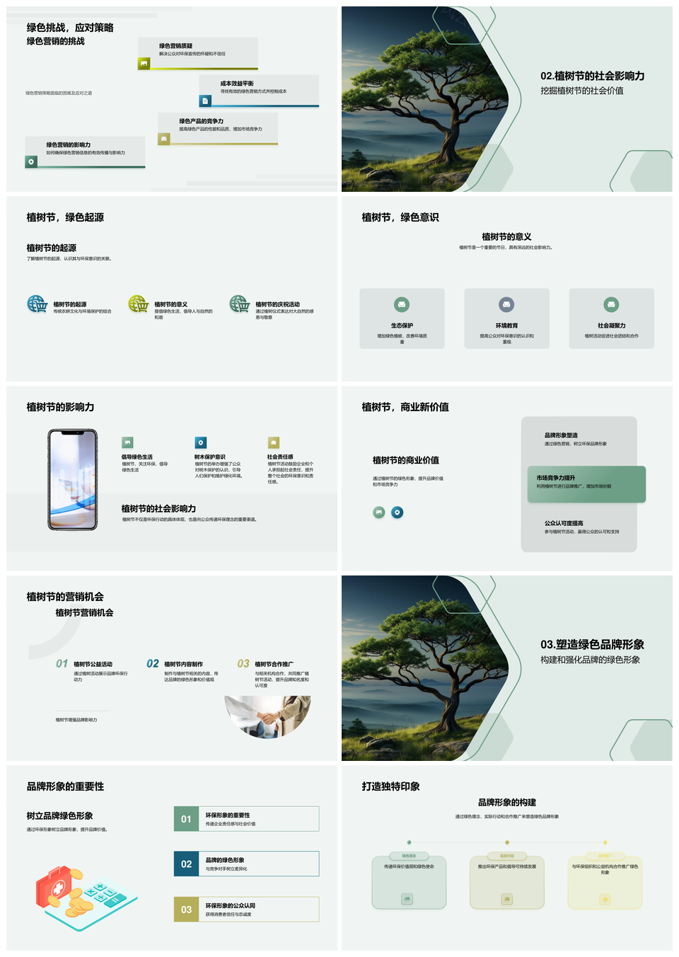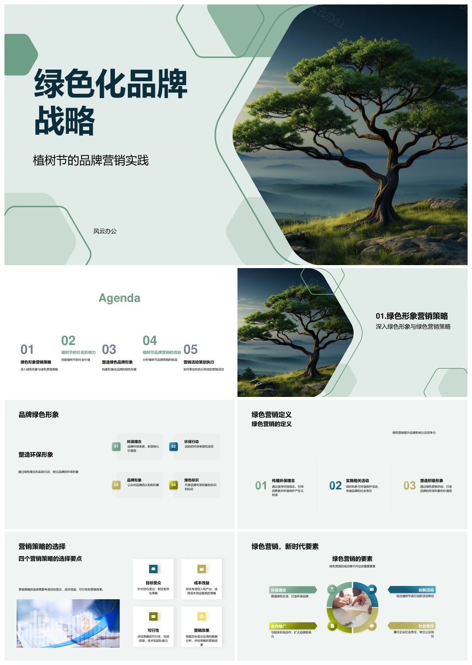 风云办公提供的绿色品牌战略植树节环保营销PPT模板,下载格式为pptx,一共33页,作品中文字及图均可以修改和编辑,图片更改请在作品中右键图片并更换,文字修改请直接点击文字进行修改。