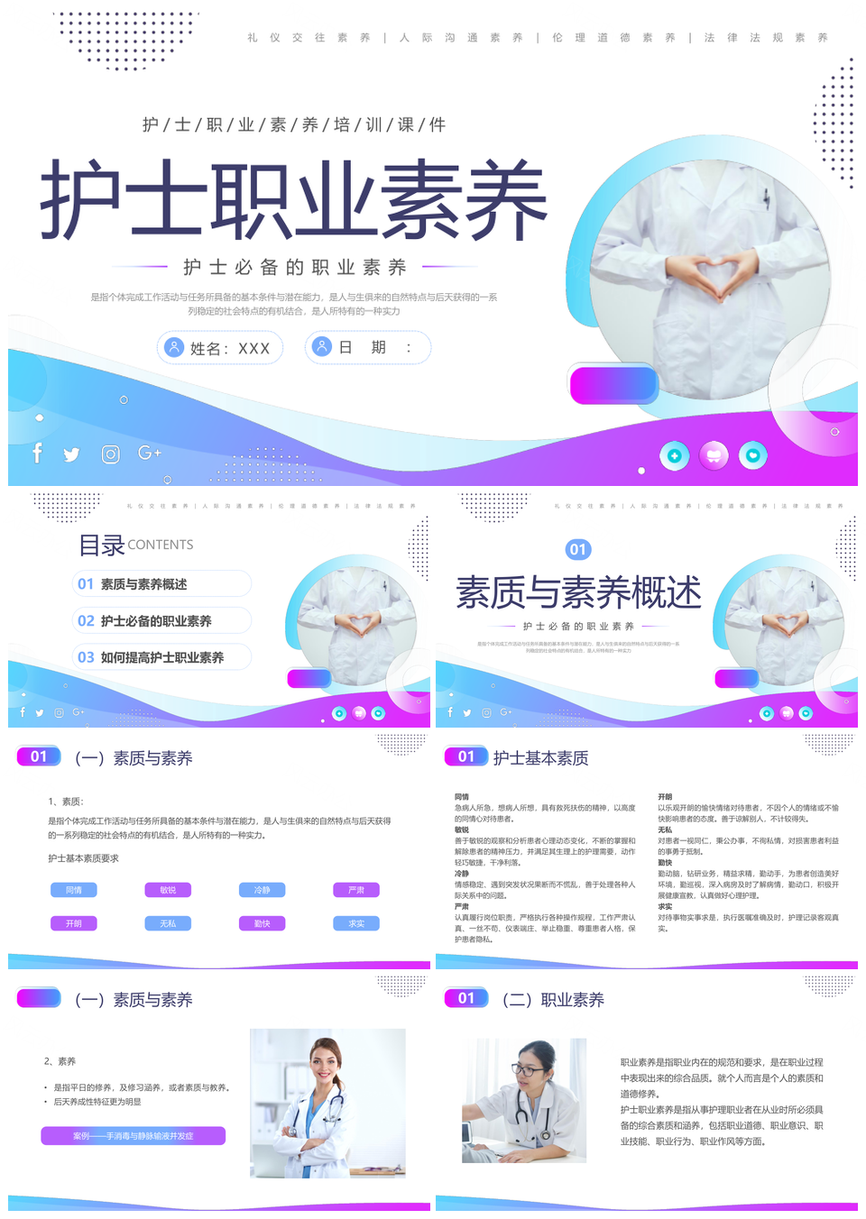 这是一张医疗护士职业素养商务实拍培训PPT课件,包含医疗、护士、职业素养、商务、实拍、培训课件等主题内容,也可用作医疗护士职业素养商务、医疗护士职业素养实拍、医疗护士职业素养培训、护士职业素养商务实拍、护士职业素养商务培训、职业素养商务实拍培训、商务实拍培训PPT课件、职业素养培训PPT课件、护士商务实拍培训、医疗职业素养PPT课件、护士实拍培训课件、医疗商务培训课件、职业素养实拍PPT、实拍培训PPT课件、医疗护士PPT课件等PPT场景使用。