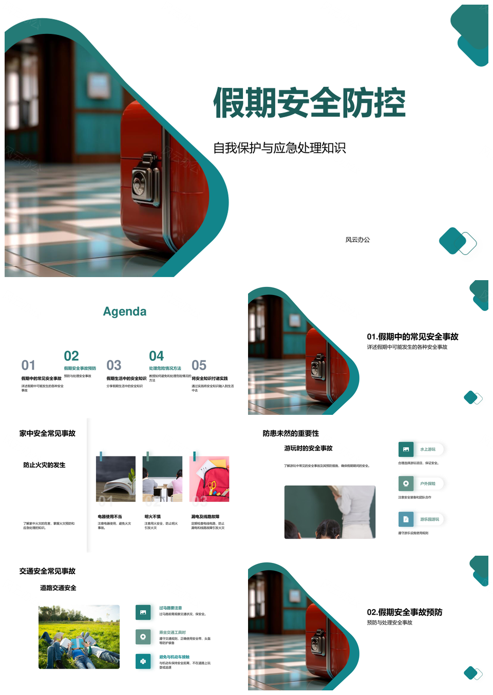 风云办公提供的假期安全防控与应急自救事故预防PPT模板,下载格式为pptx,一共25页,作品中文字及图均可以修改和编辑,图片更改请在作品中右键图片并更换,文字修改请直接点击文字进行修改。