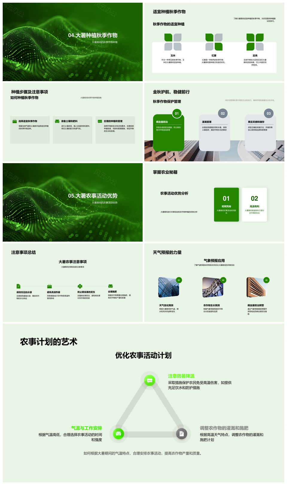 这是一张大暑农事活动与作物管理气候病虫防治PPT模板,包含大暑、农事活动、作物管理、气候、病虫防治等主题内容,也可用作大暑农事活动作物管理气候病虫防治、大暑农事活动作物管理气候、农事活动作物管理气候病虫防治、大暑作物管理气候病虫防治、大暑农事活动作物管理、农事活动作物管理气候、作物管理气候病虫防治、大暑农事活动气候、大暑作物管理气候、农事活动气候病虫防治、大暑气候病虫防治、农事活动作物管理、作物管理气候、大暑农事活动、气候病虫防治等PPT场景使用。