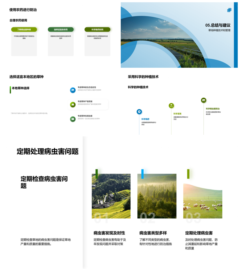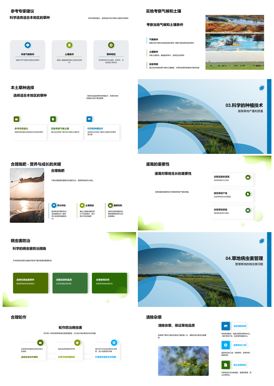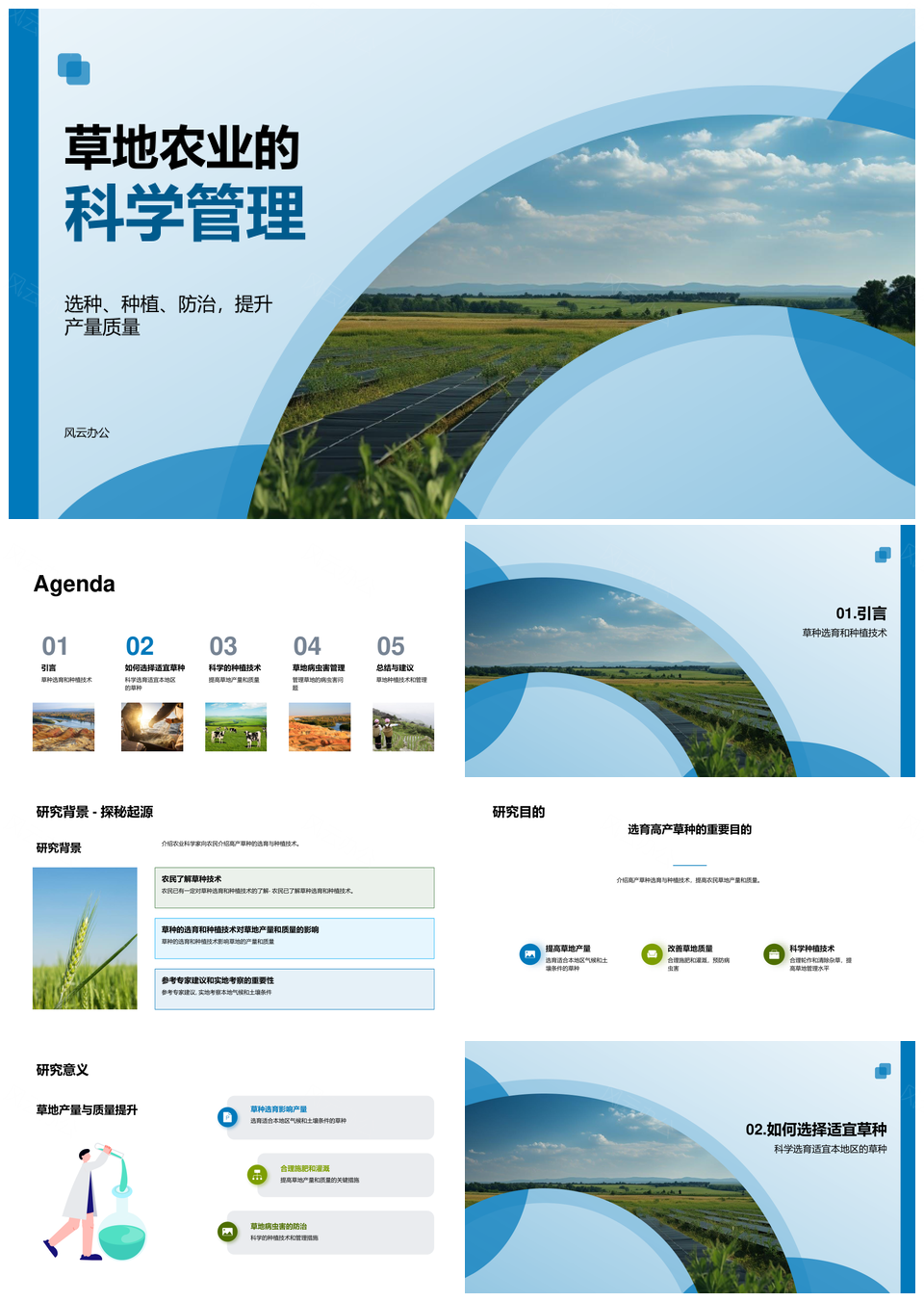 这是一张高产草种选育与种植技术提升草地产量质量PPT模板,包含高产草种、选育、种植技术、提升、草地、产量、质量等主题内容,也可用作高产草种选育种植技术、草种选育种植技术提升、种植技术提升草地产量、提升草地产量质量、高产草种选育、草种选育提升、选育种植技术提升、种植技术提升草地、提升草地产量、草地产量质量、高产草种、草种选育、选育种植技术、种植技术提升、草地产量等PPT场景使用。 风云办公提供的高产草种选育与种植技术提升草地产量质量PPT模板,下载格式为pptx,一共23页,作品中文字及图均可以修改和编辑,图片更改请在作品中右键图片并更换,文字修改请直接点击文字进行修改。