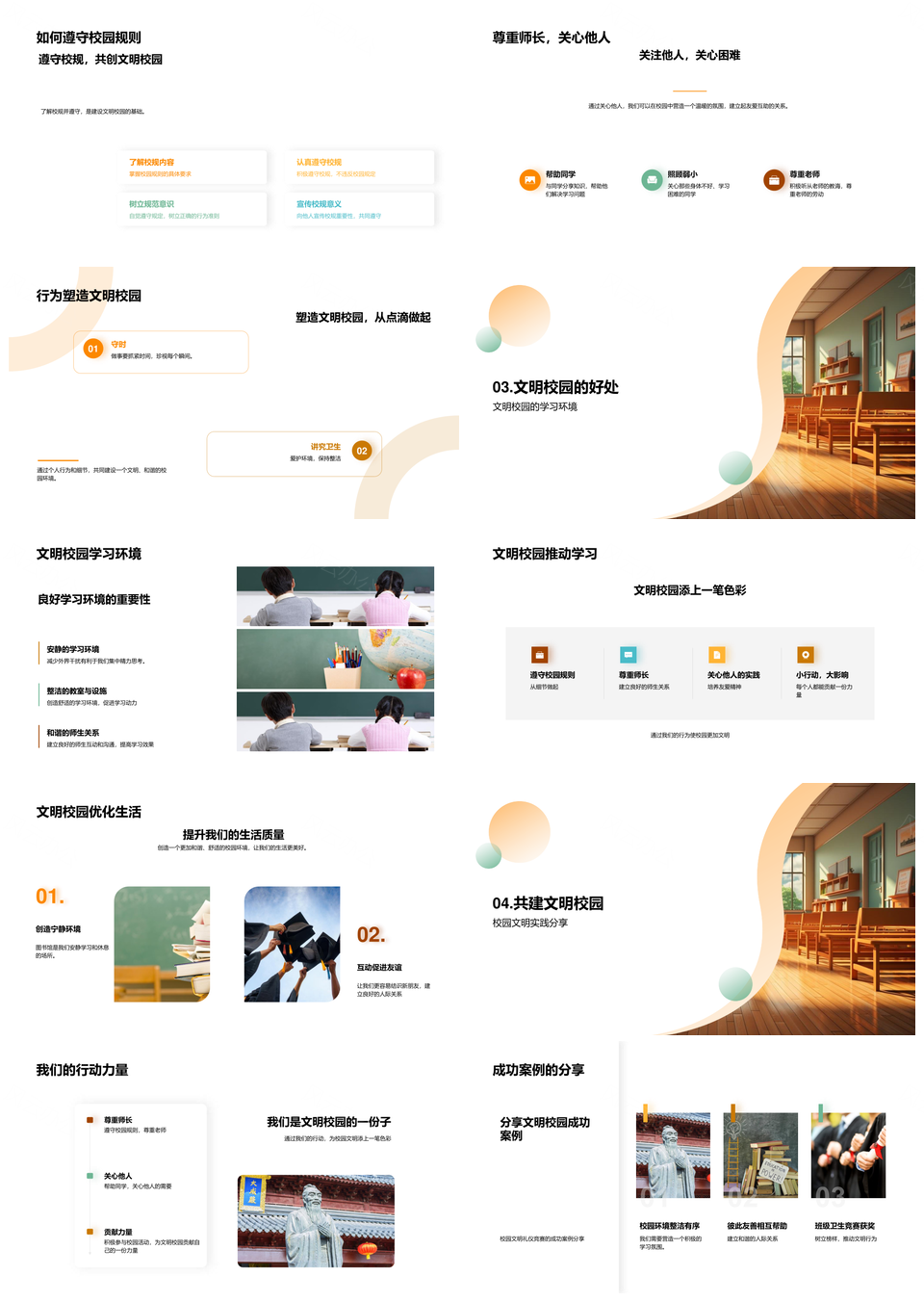 风云办公提供的师生守规共建文明校园良好环境PPT模板,下载格式为pptx,一共23页,作品中文字及图均可以修改和编辑,图片更改请在作品中右键图片并更换,文字修改请直接点击文字进行修改。