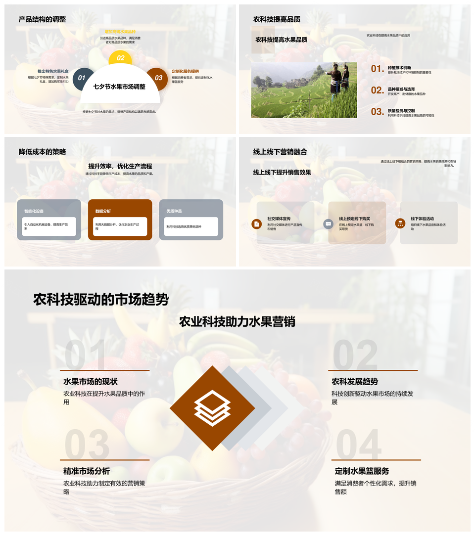 这是一张农业科技定制七夕果篮营销PPT模板,包含农业科技、定制、七夕果篮、营销等主题内容,也可用作农业科技定制果篮、农业科技果篮营销、定制七夕果篮营销、科技定制七夕果篮、农业定制七夕果篮、农业科技定制营销、七夕果篮营销、农业科技营销、科技定制果篮、定制果篮营销、农业科技果篮、农业科技、七夕果篮、果篮营销、定制七夕等PPT场景使用。
