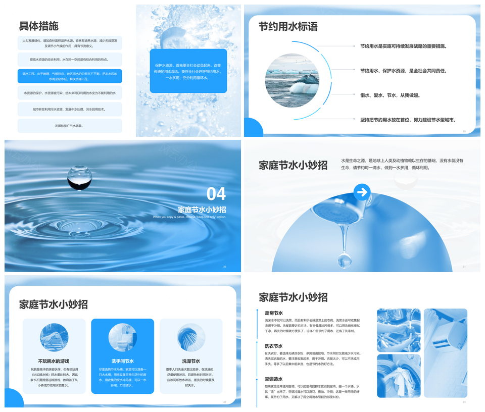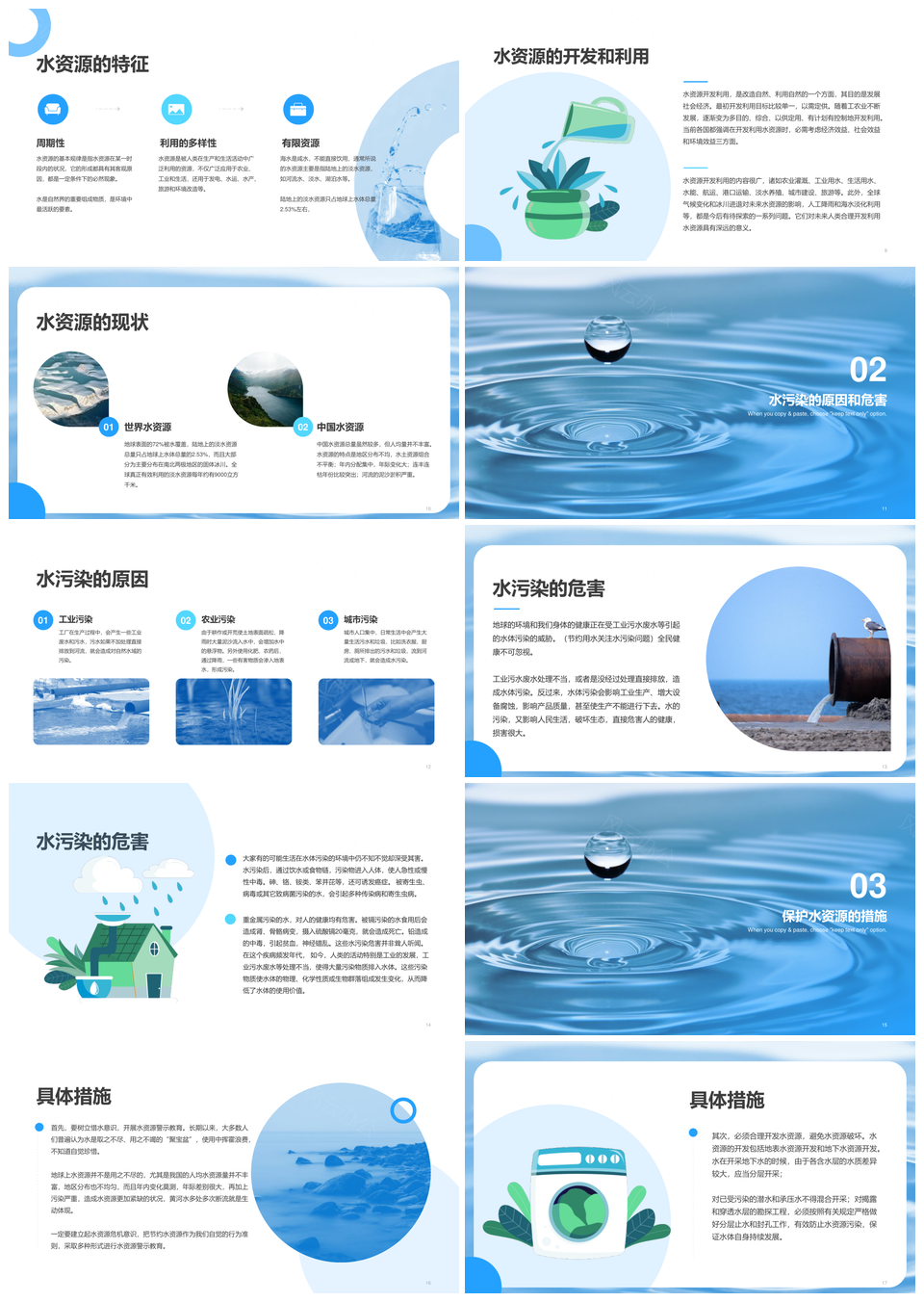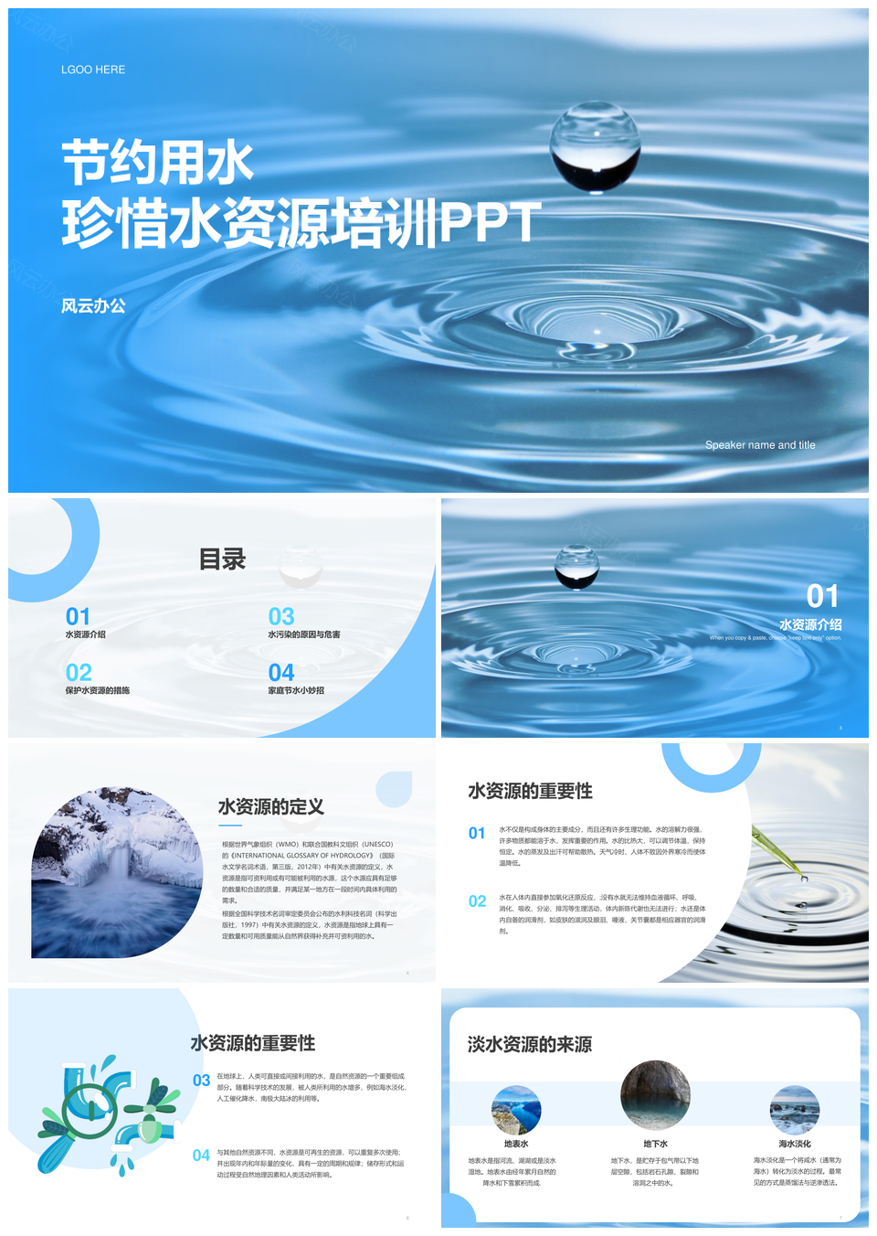 风云办公提供的蓝色现代节水教育珍惜水资源培训PPT模板,下载格式为pptx,一共24页,作品中文字及图均可以修改和编辑,图片更改请在作品中右键图片并更换,文字修改请直接点击文字进行修改。