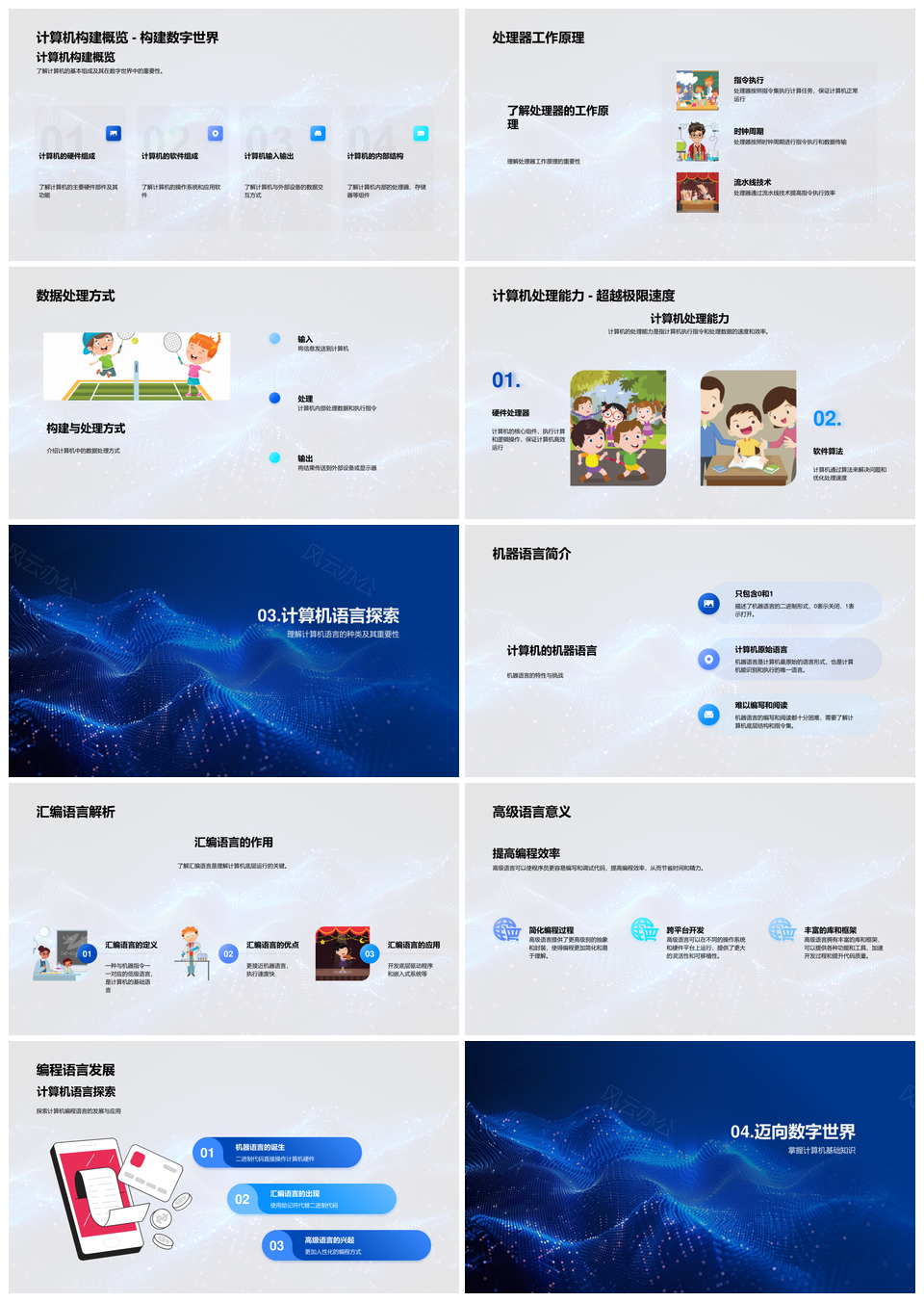 这是一张计算机基础教学数字之旅发展史组成数据处理器语言PPT模板,包含计算机基础、教学、数字之旅、发展史、组成、数据处理器、语言等主题内容,也可用作计算机基础教学数字、基础教学数字之旅、教学数字之旅发展史、数字之旅发展史组成、之旅发展史组成数据、发展史组成数据处理器、组成数据处理器语言、计算机基础教学、基础教学数字、教学数字之旅、数字之旅发展史、发展史组成数据、组成数据处理器、数据处理器语言、数据处理器等PPT场景使用。 风云办公提供的计算机基础教学数字之旅发展史组成数据处理器语言PPT模板,下载格式为pptx,一共25页,作品中文字及图均可以修改和编辑,图片更改请在作品中右键图片并更换,文字修改请直接点击文字进行修改。